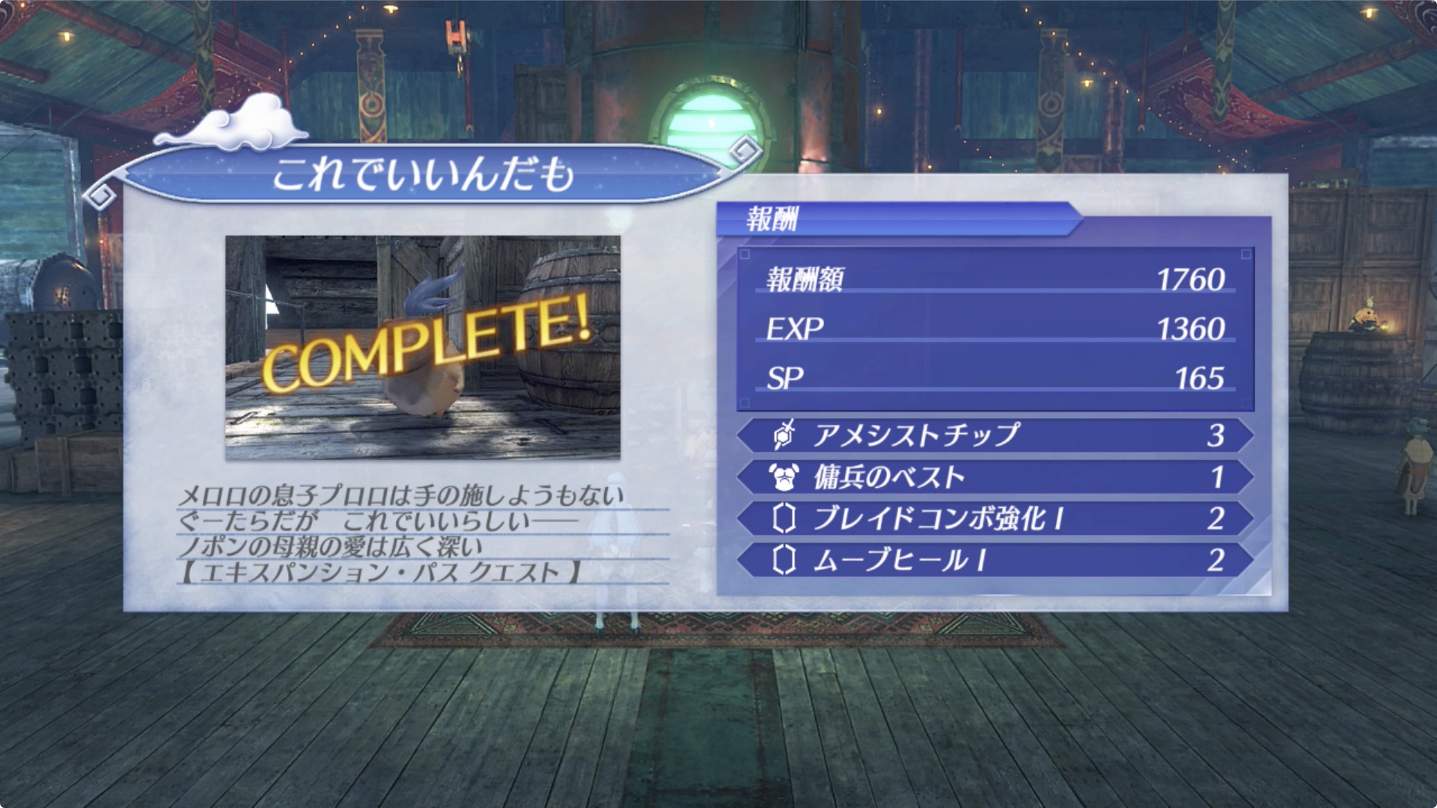 보상 아이템 : 아메시스트칩(アメシストチップ) x3, 용병의 베스트(傭兵のベスト), 블레이드 콤보강화I(ブレイドコンボ強化I) x2, 무브 힐 I(ムーブヒールI) x2