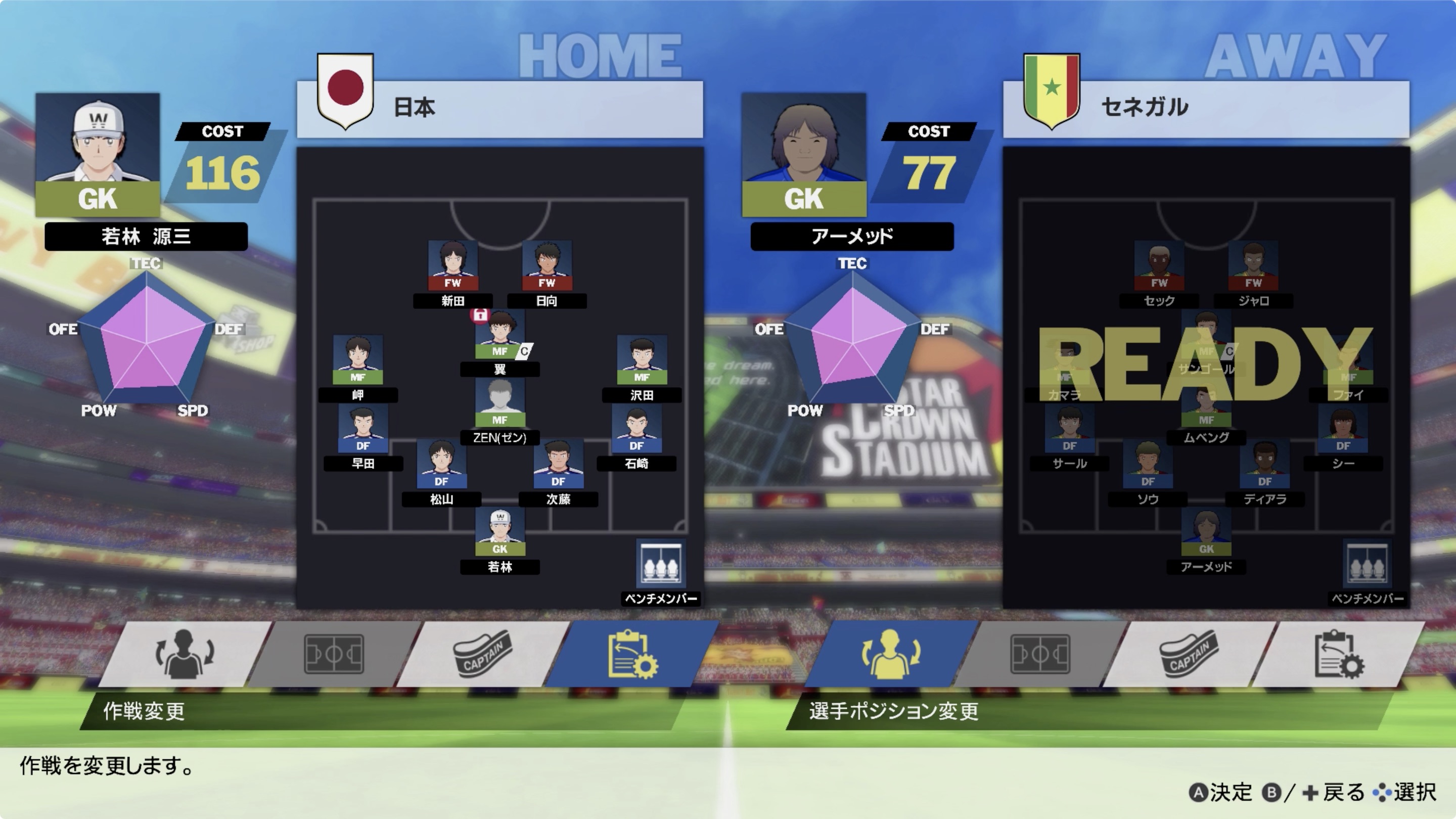 *작전의 변경은 팀 관리 > 작전 변경에서 설정 가능하며, 십자 키의 각 방향에 작전을 지정할 수 있습니다..