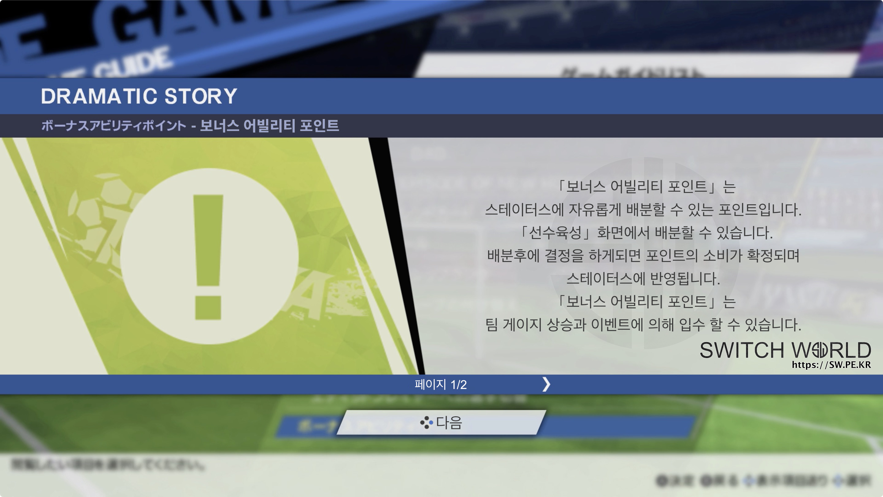 처음에는 주전선수정도의 능력은 없는 에디트 플레이어지만 시합과 이벤트를 통해서 다양한 선수들과의 교류를 통해 스테이터 상승과 스킬의 습득을 할 수 있습니다.