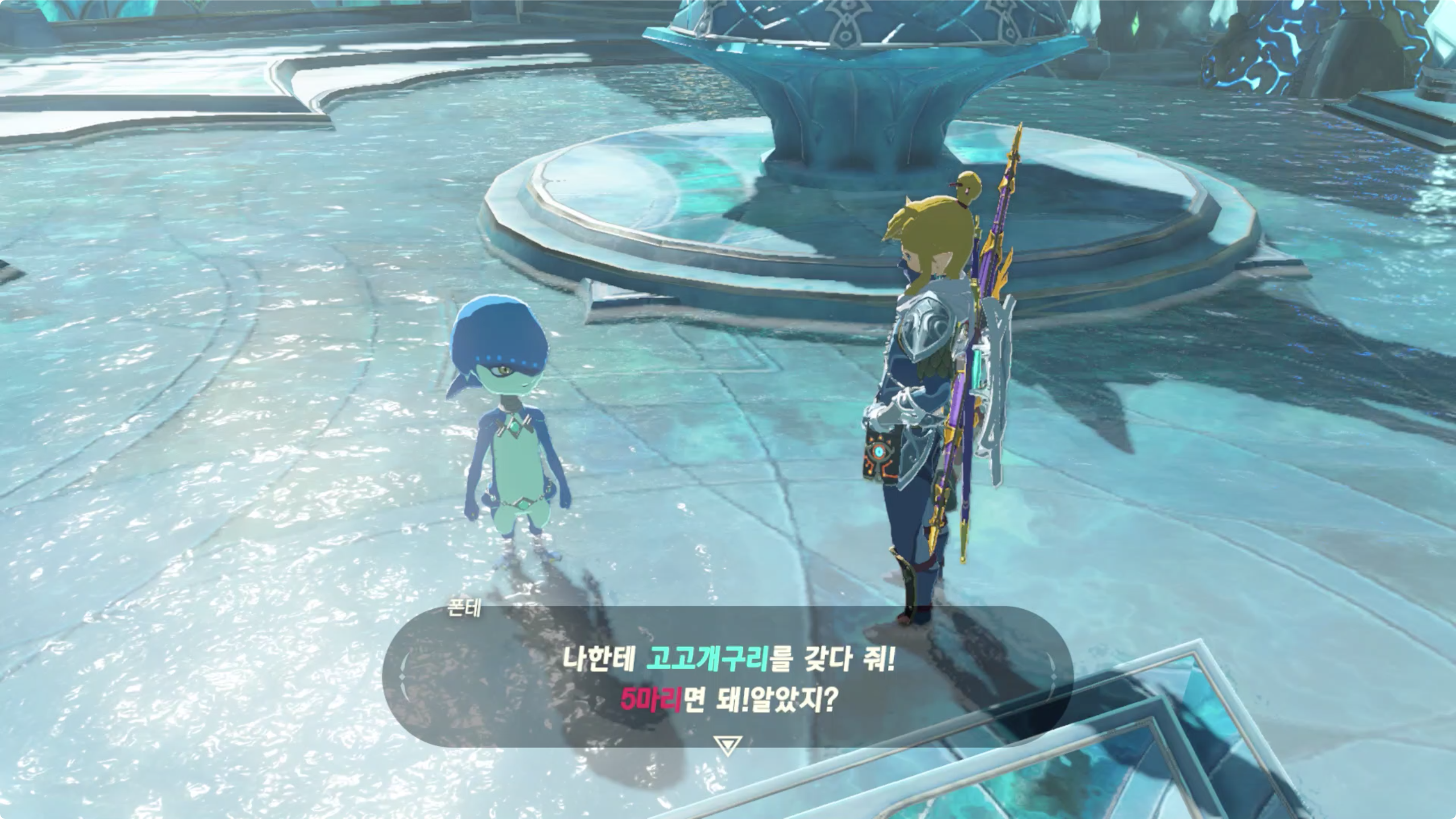 고고개구리 5개를 가져다 돌라고 하며, 이미 가지고 있다면 바로 대화를 걸면 된다.