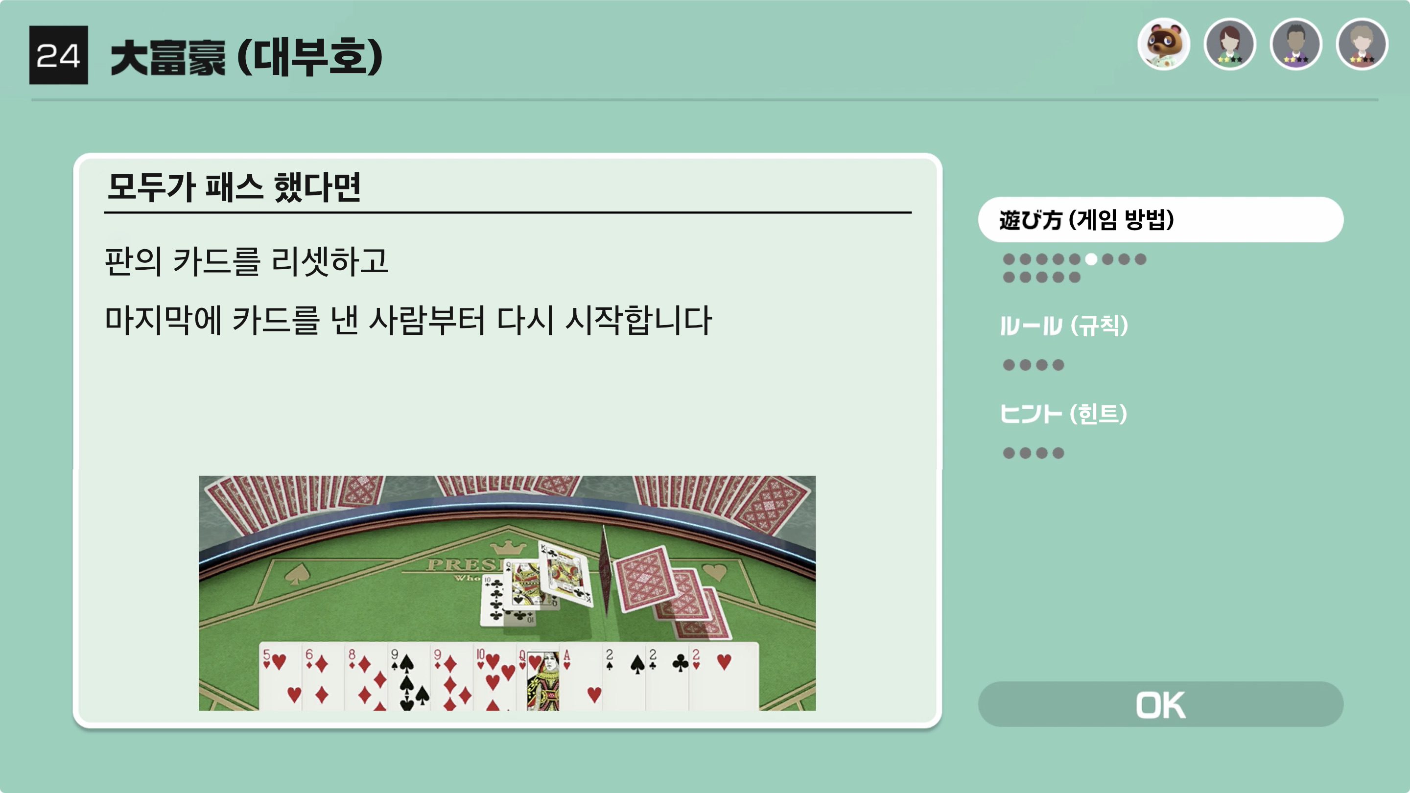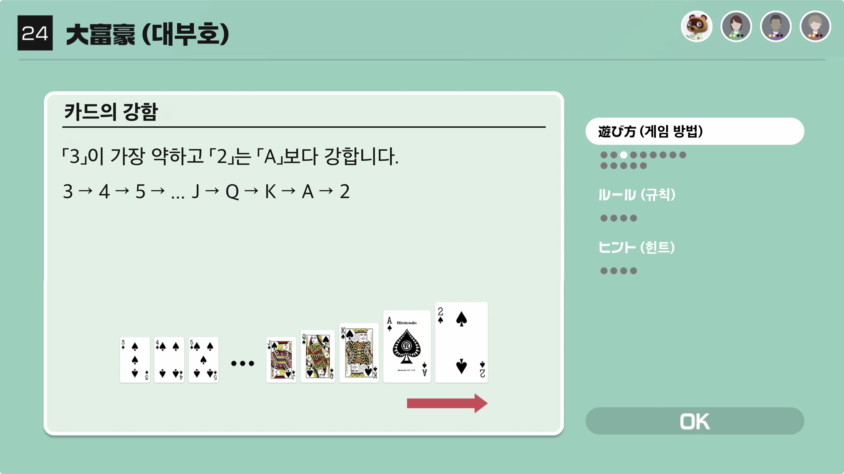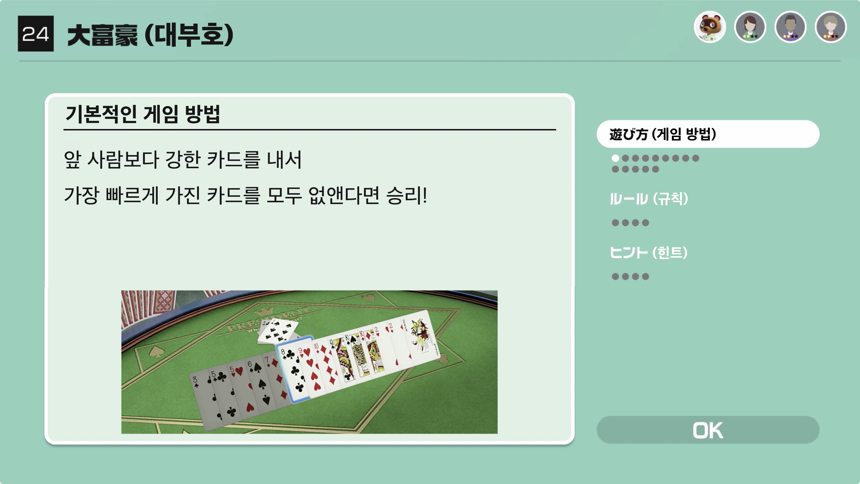 앞 사람보다 강한 카드를 내서 가장 빠르게 가진 카드를 모두 없앤다면 승리!