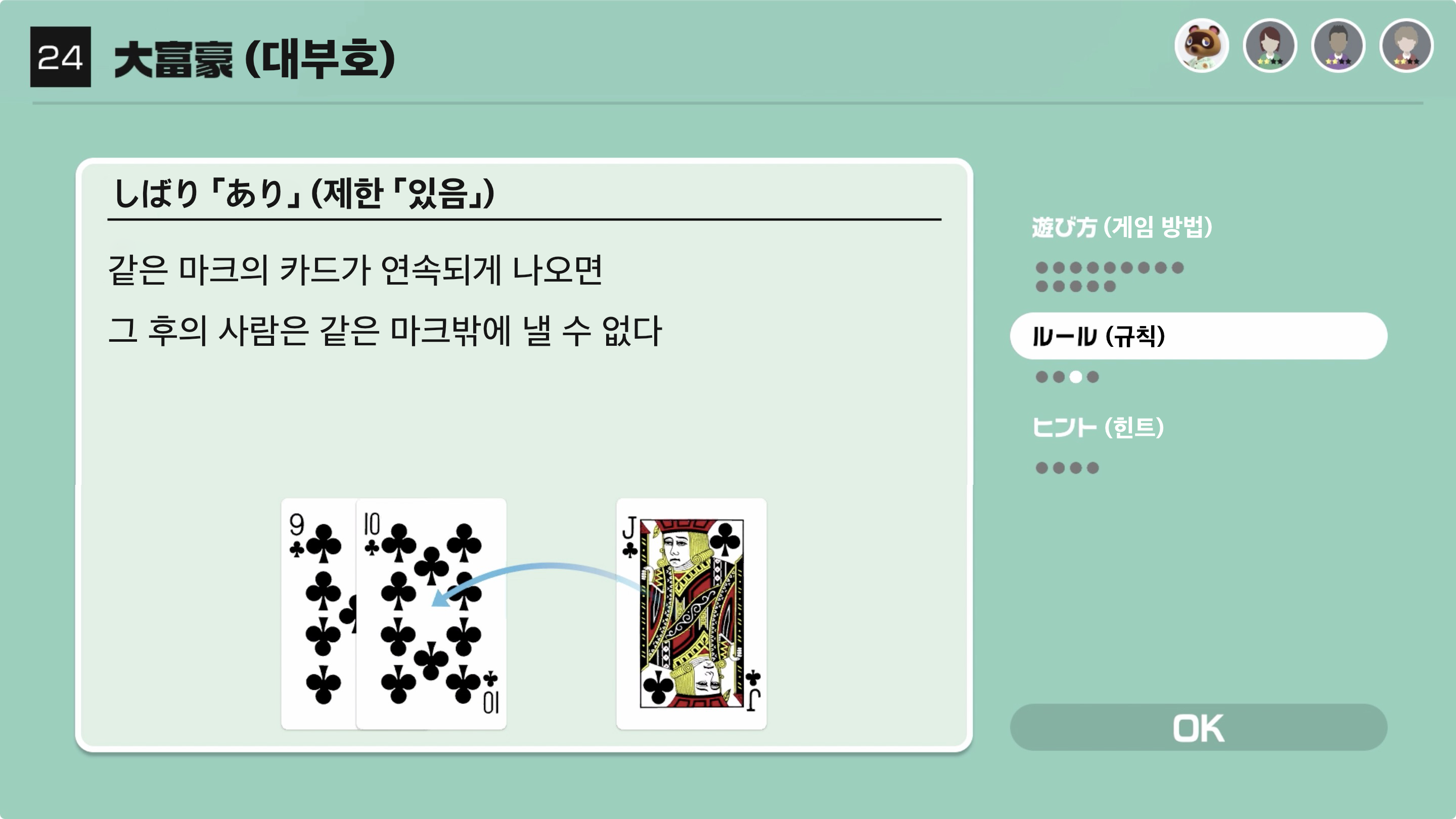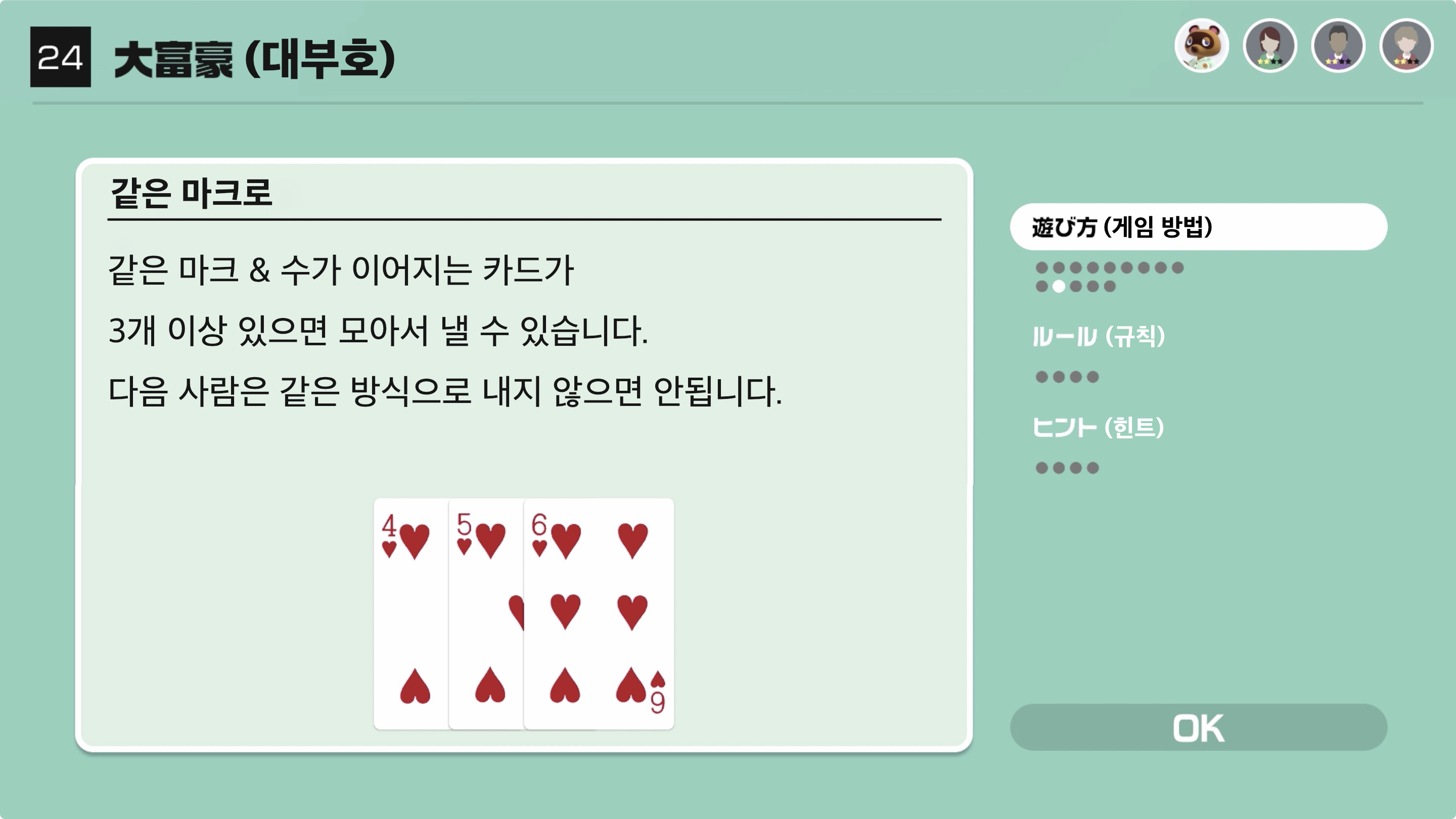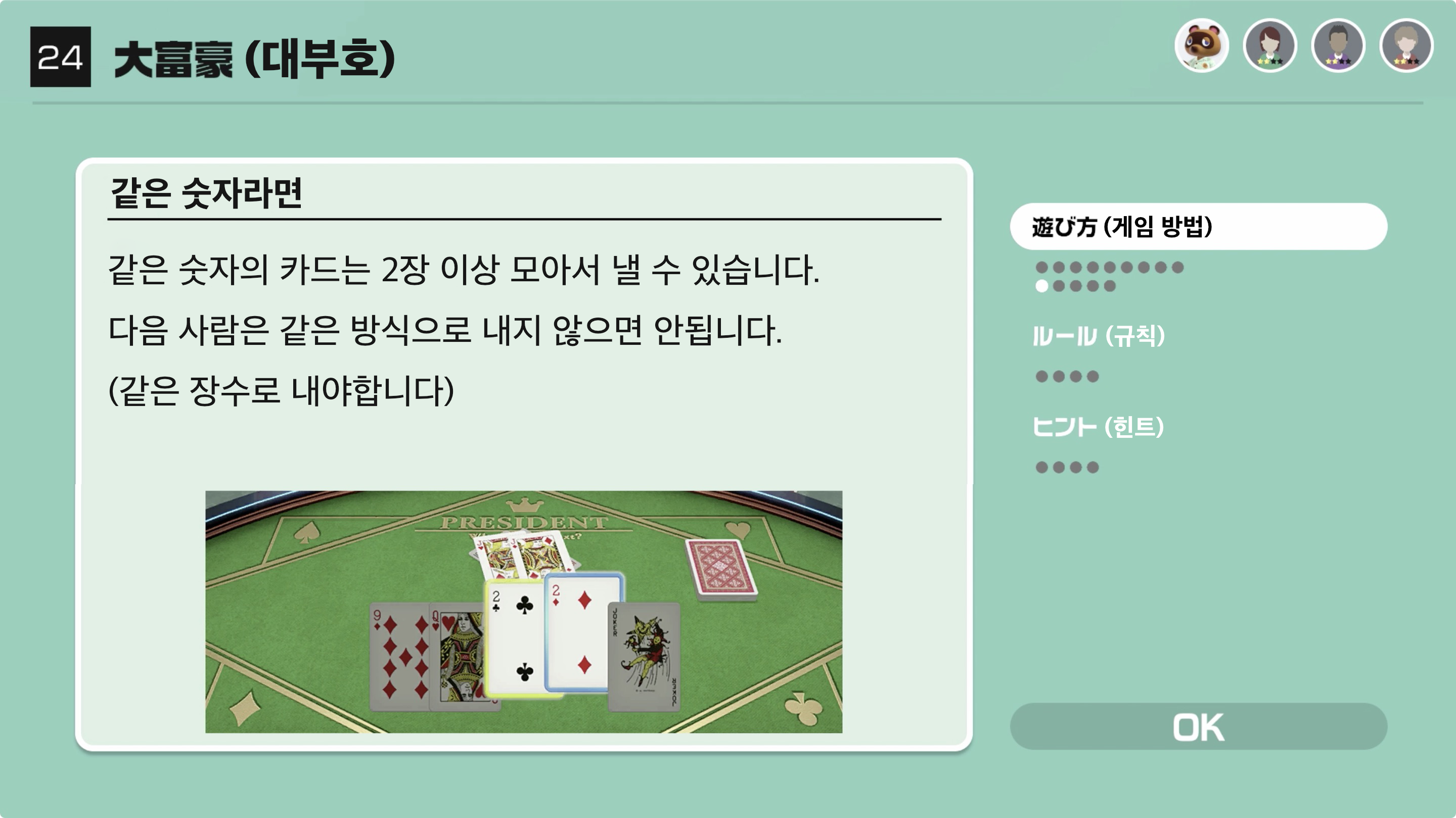 앞 사람보다 강한 카드를 내서 가장 빠르게 가진 카드를 모두 없앤다면 승리!