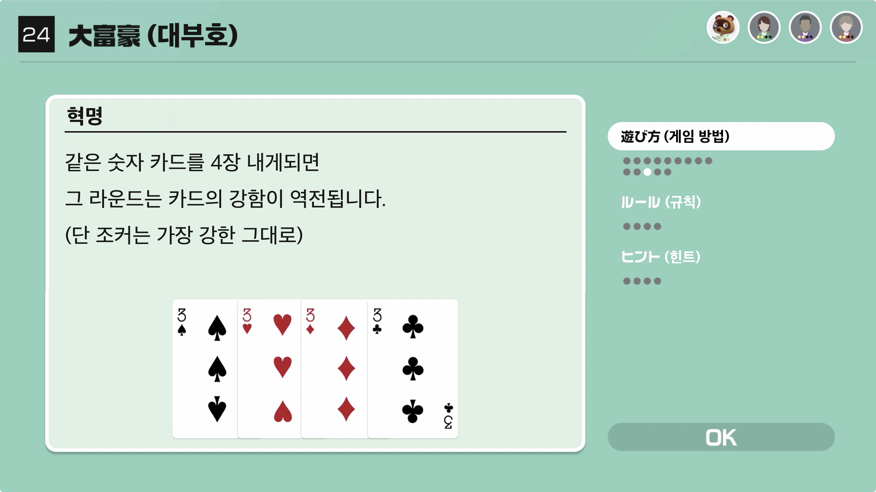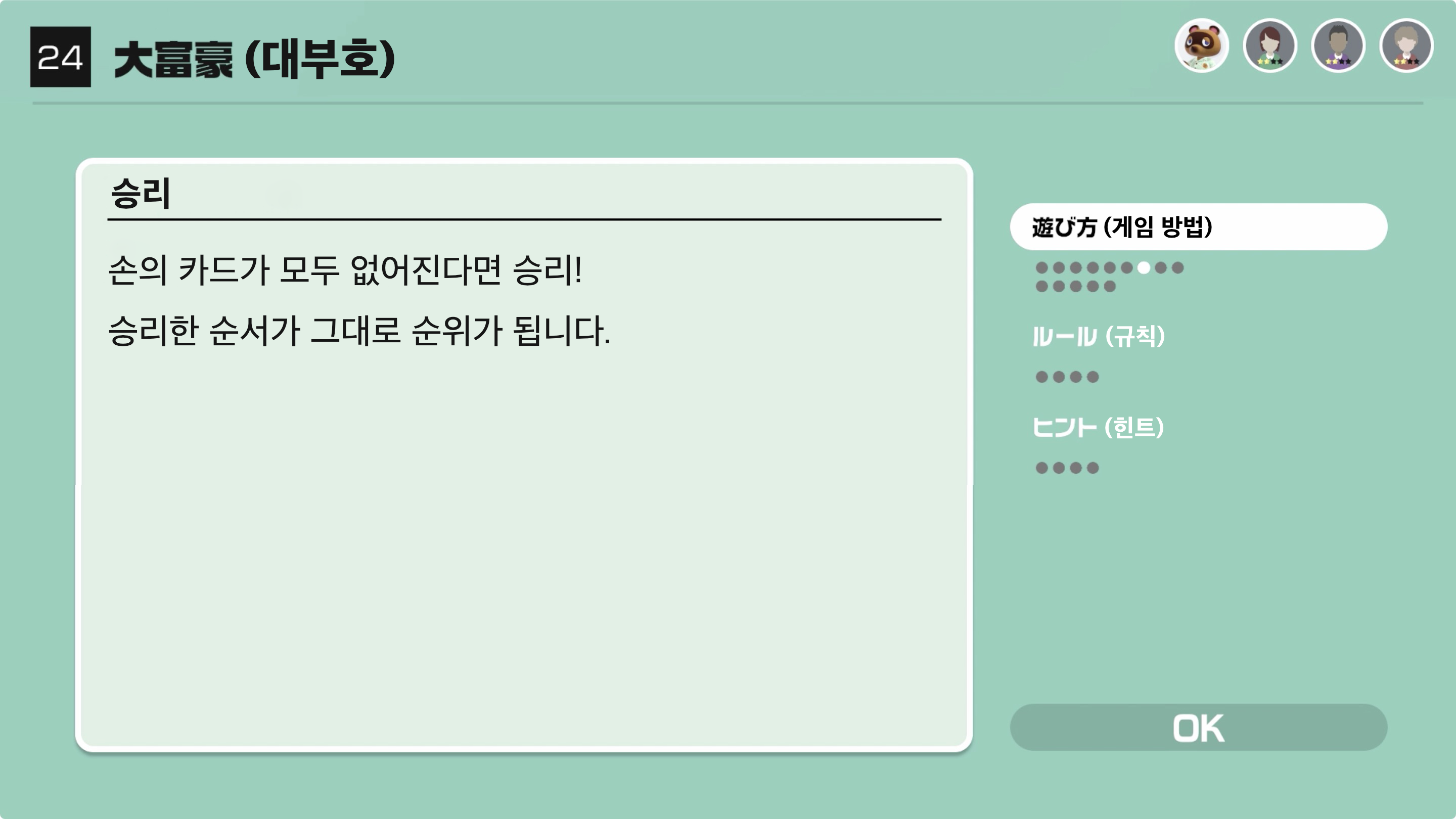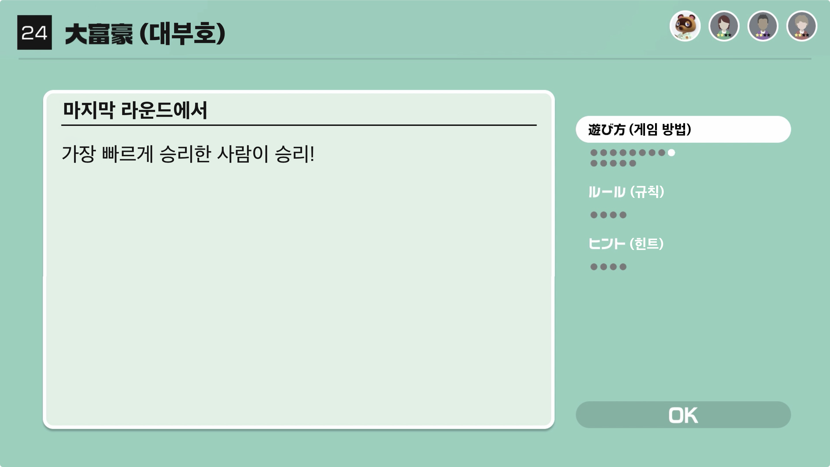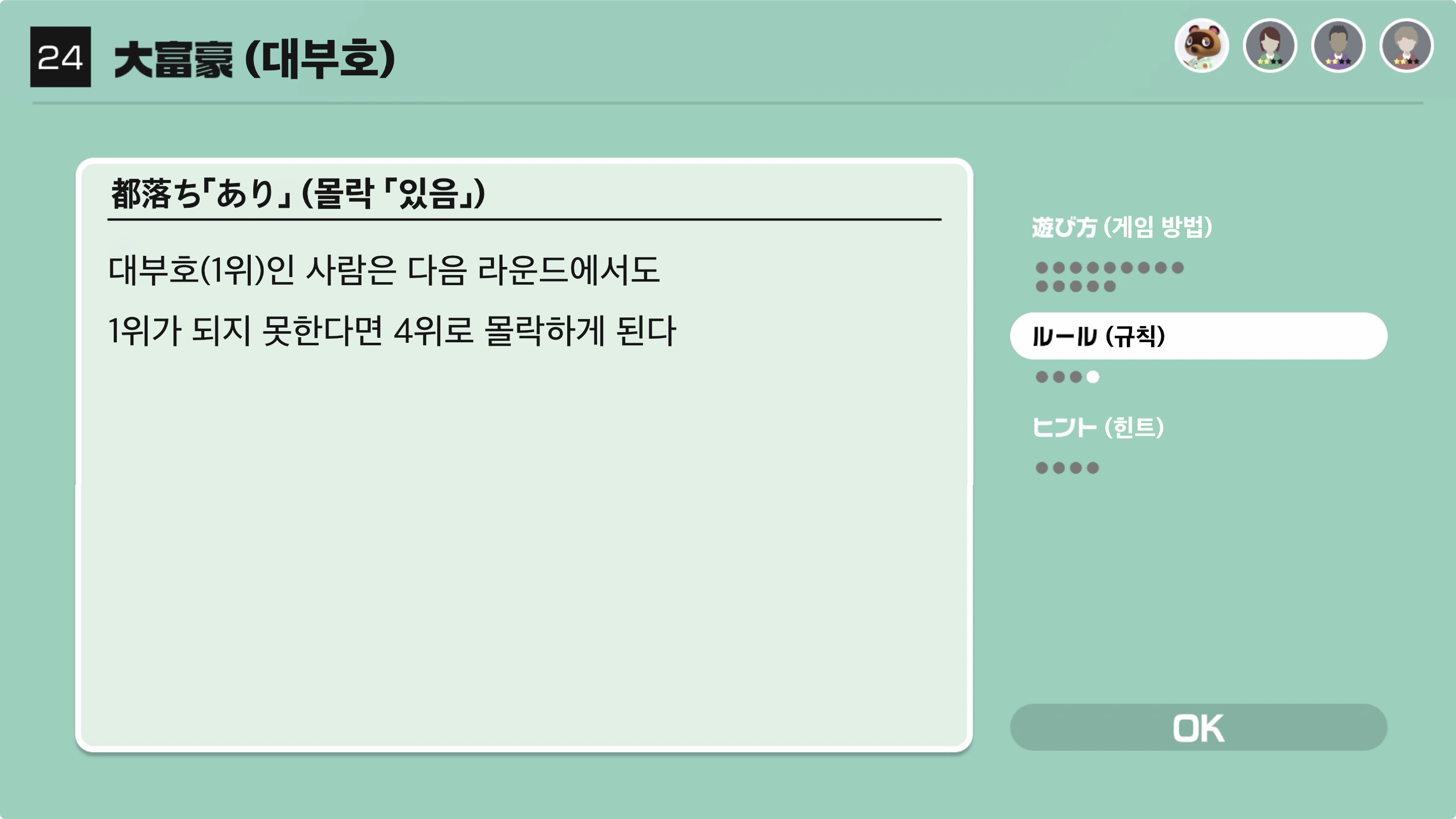 대부호(1위)인 사람은 다음 라운드에서도 1위가 되지 못한다면 4위로 몰락하게 된다