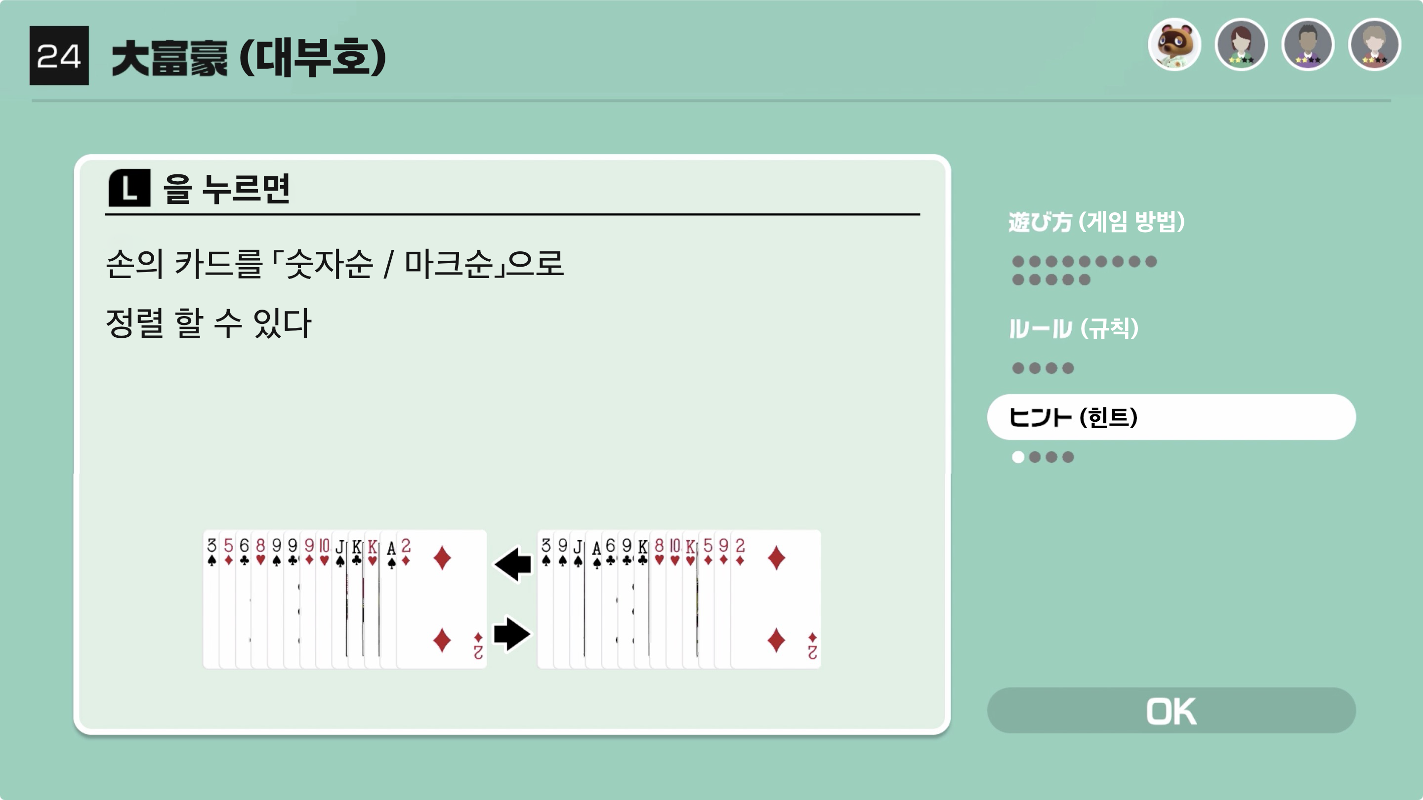 손의 카드를 「숫자순 / 마크순」으로 정렬 할 수 있다