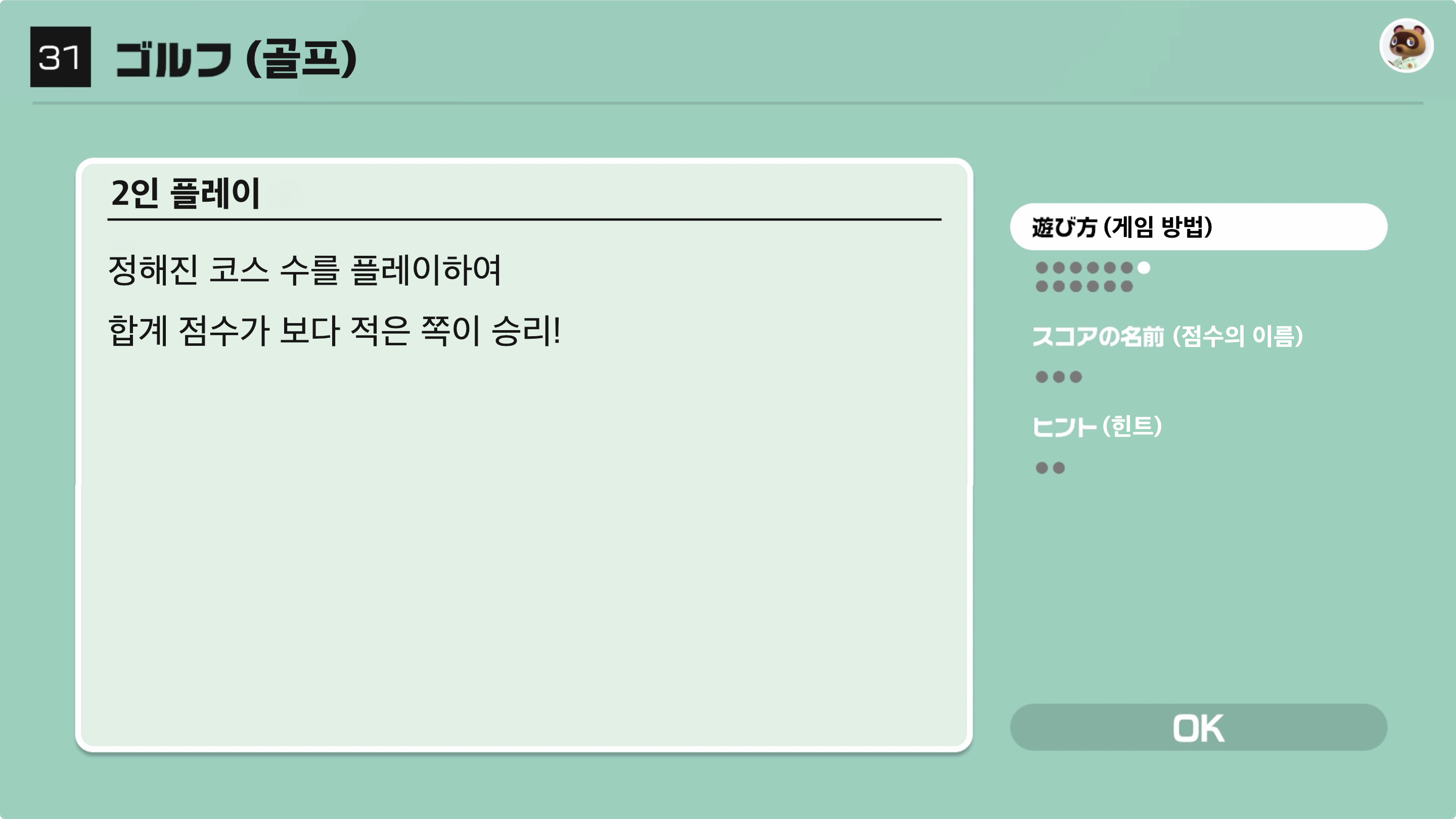 정해진 코스 수를 플레이하여 합계 점수가 보다 적은 쪽의 승리!