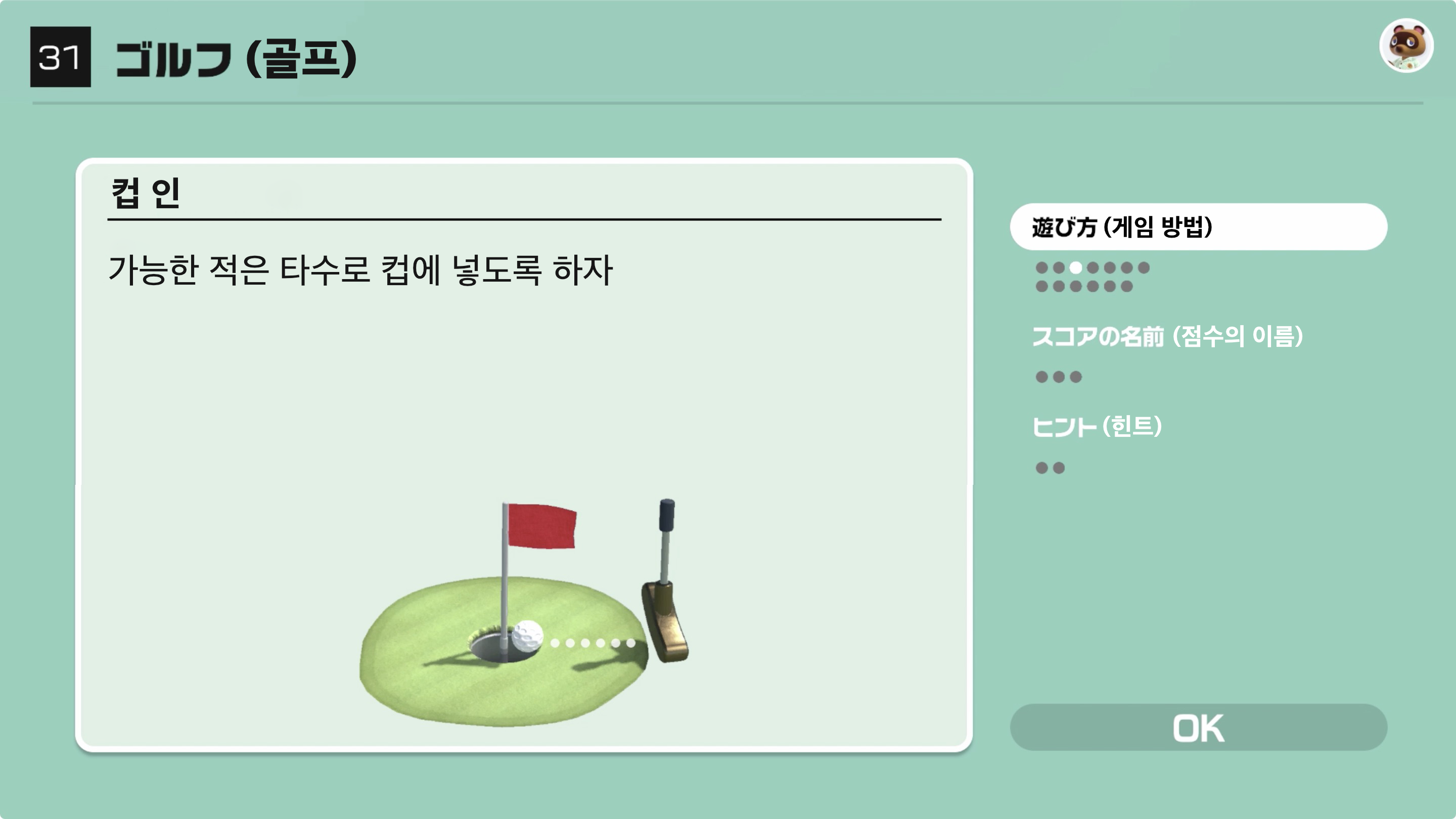 가능한 적은 타수로 컵에 넣도록 하자