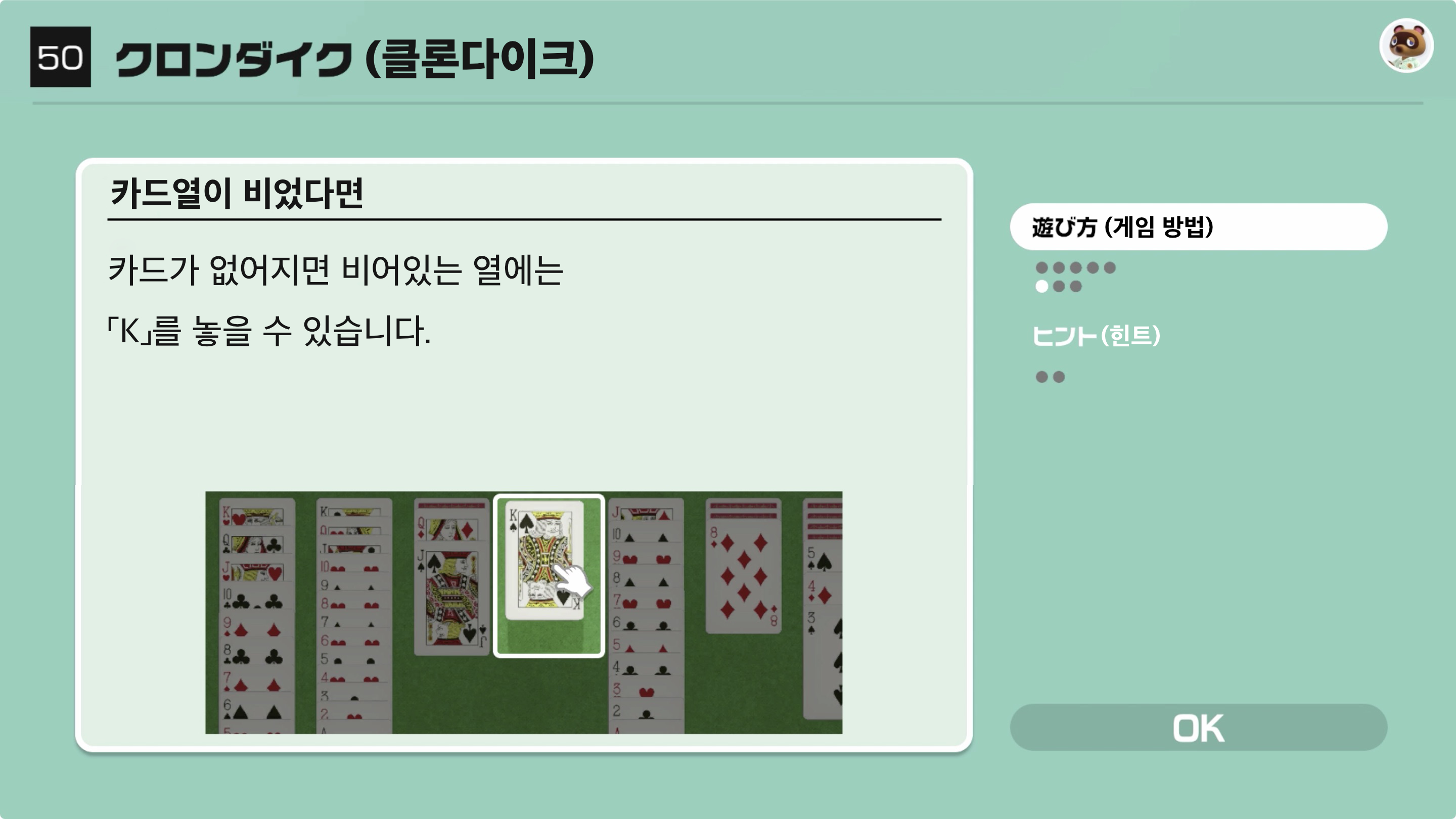 카드가 없어지면 비어있는 열에는 「K」를 놓을 수 있습니다.