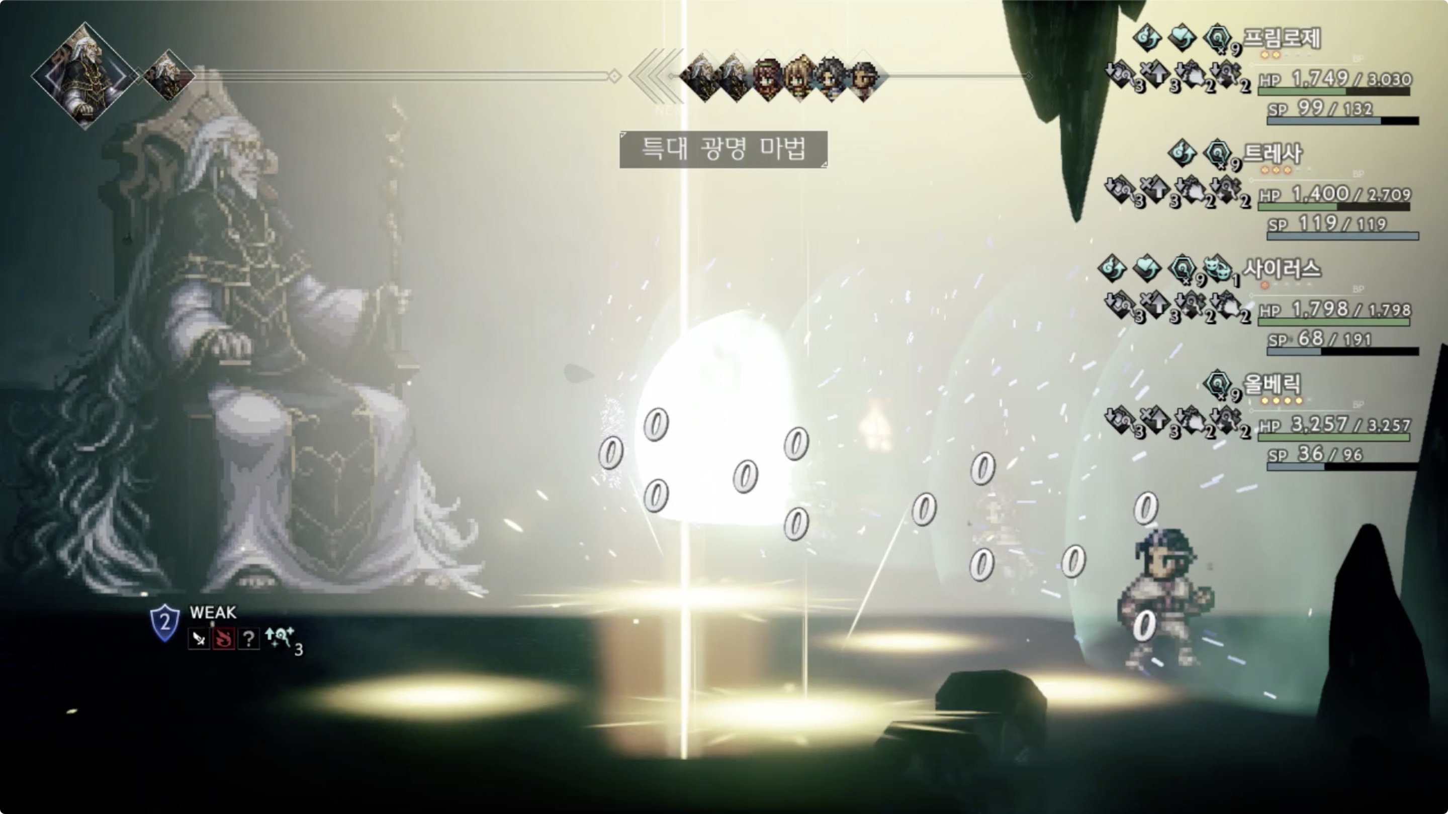 | 특대 광명 마법 | 36 | 적 전체에게 빛 속성 대미지를 3회 준다 | 빛 |