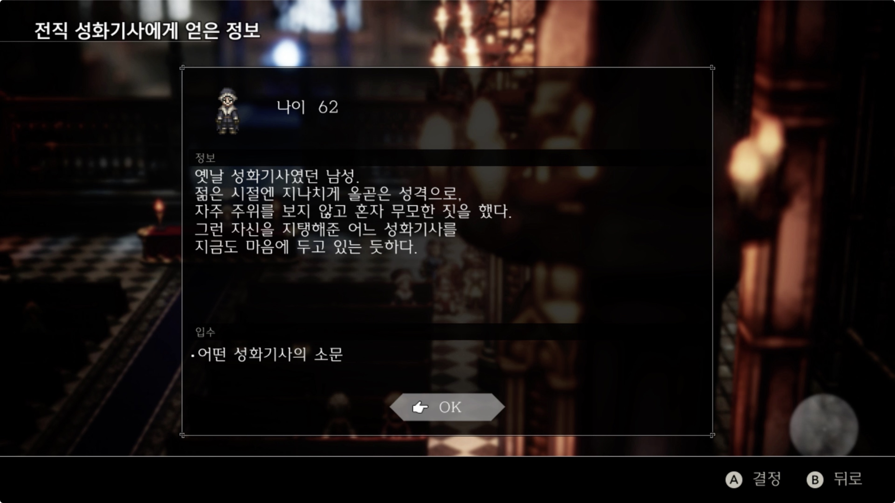 02. 대성당 오른쪽 위의 의자에 앉아있는 '전직 성화기사'에게 [탐색/질문]을 이용해 '어떤 성화기사의 소문'을 입수한다.