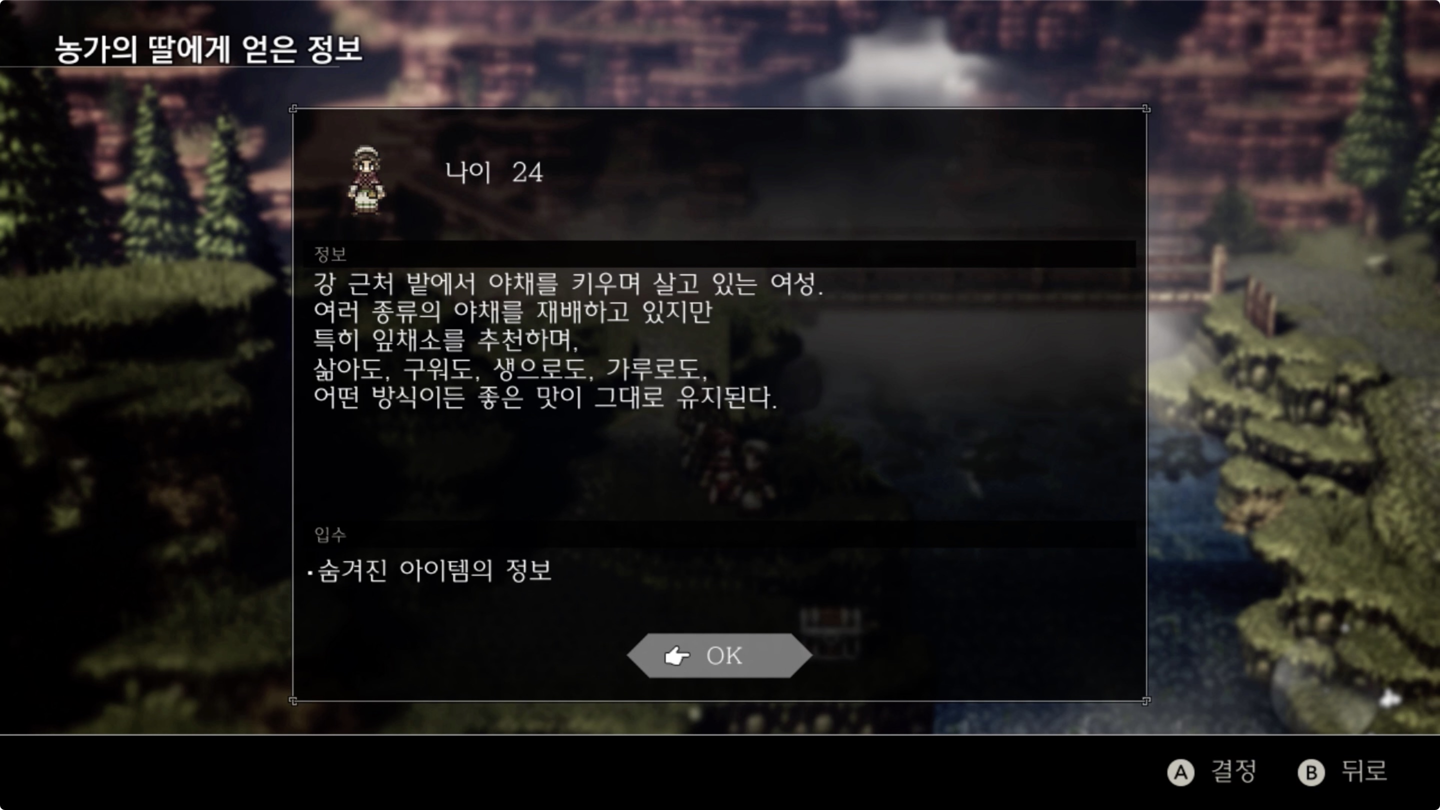 02. 중앙쯤에 있는 '농가의 딸'에게 [탐색/질문]을 이용해 '숨겨진 아이템의 정보'를 입수