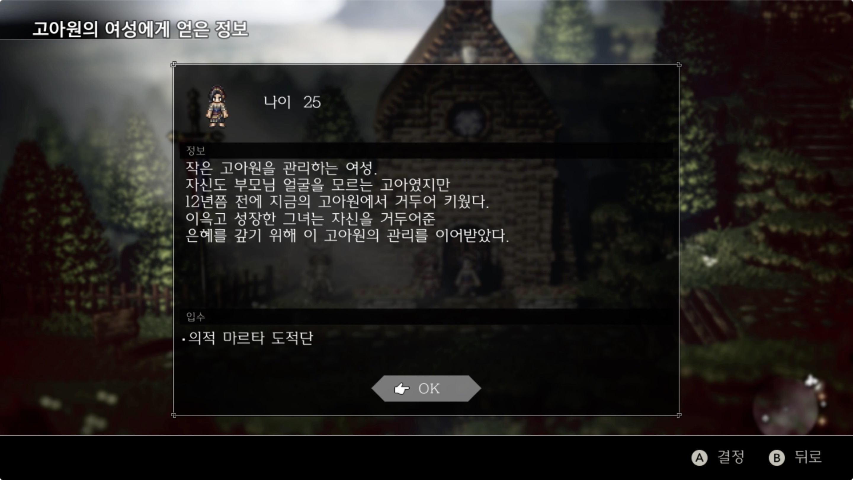 02. 마을 왼쪽 아래에 있는 '고아원의 여성'에게 [탐색/질문]을 통해 '의적 마르타 도적단'의 정보를 입수