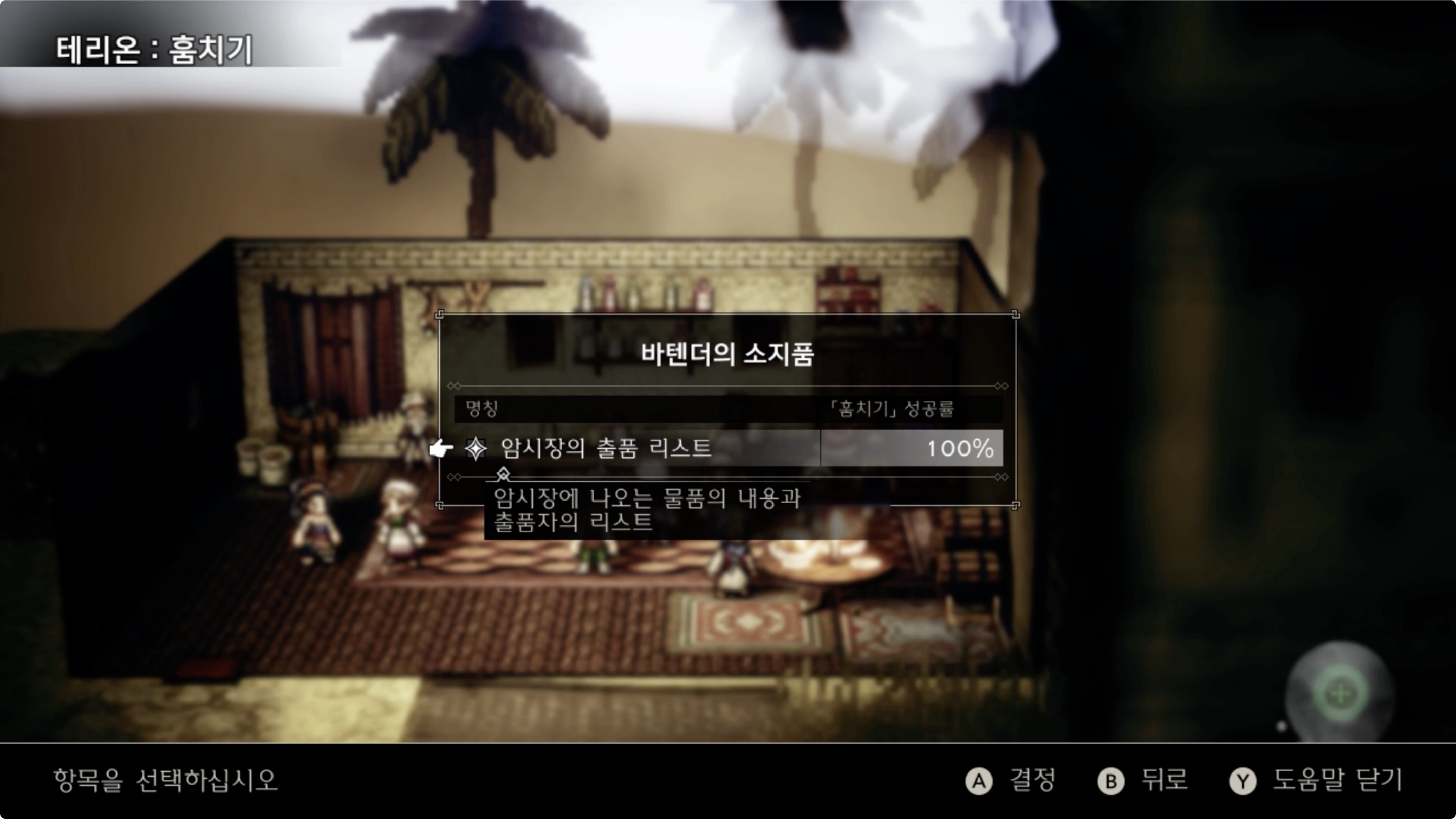 마을(웰스프링)로 돌아와 주점의 바텐더에게서 '암시장의 출품 리스트'를 훔친다