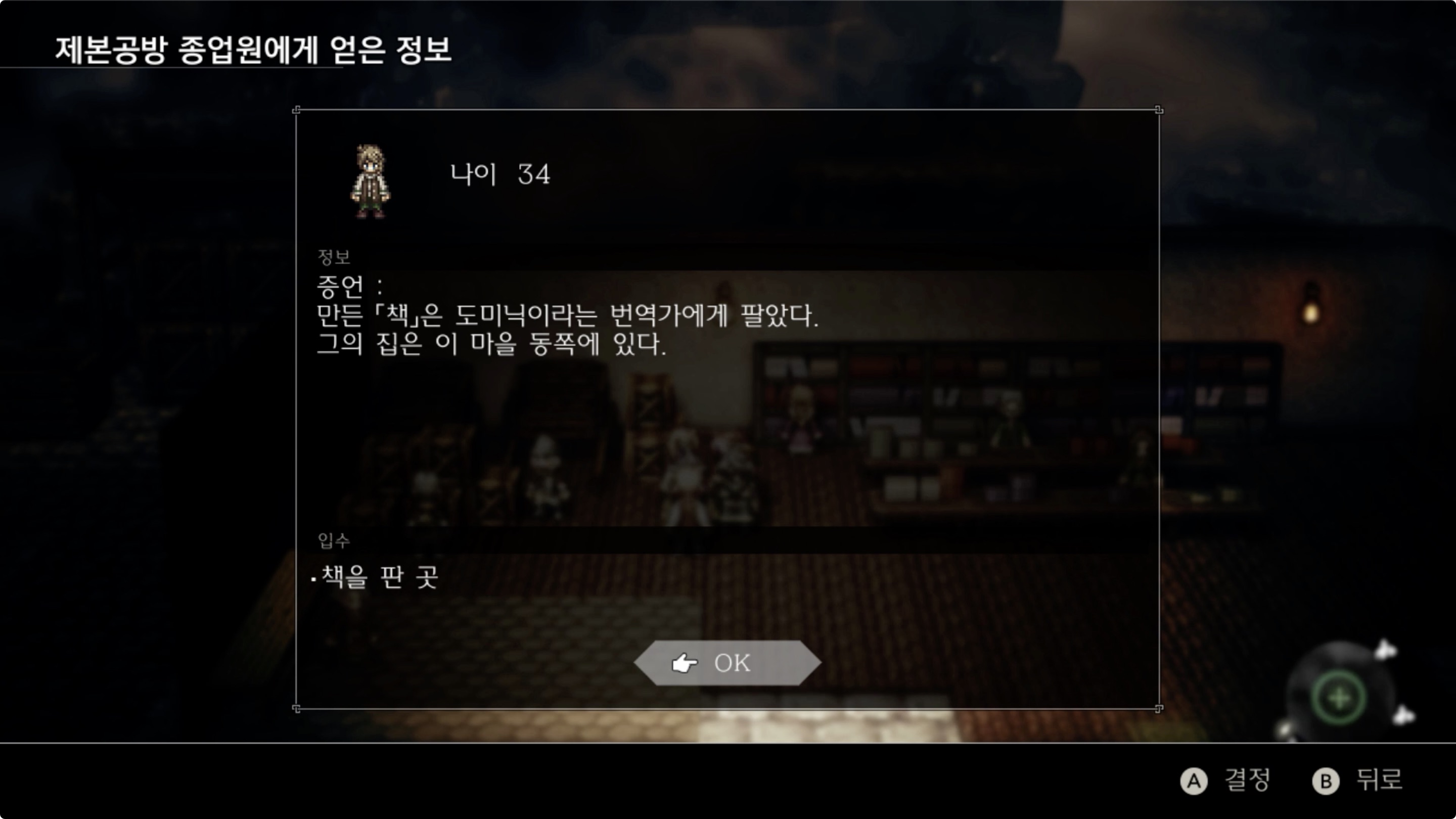 제본공방 내부에 있는 '제본공방 종업원'을 탐색하여 '책을 판 곳'을 알아내자