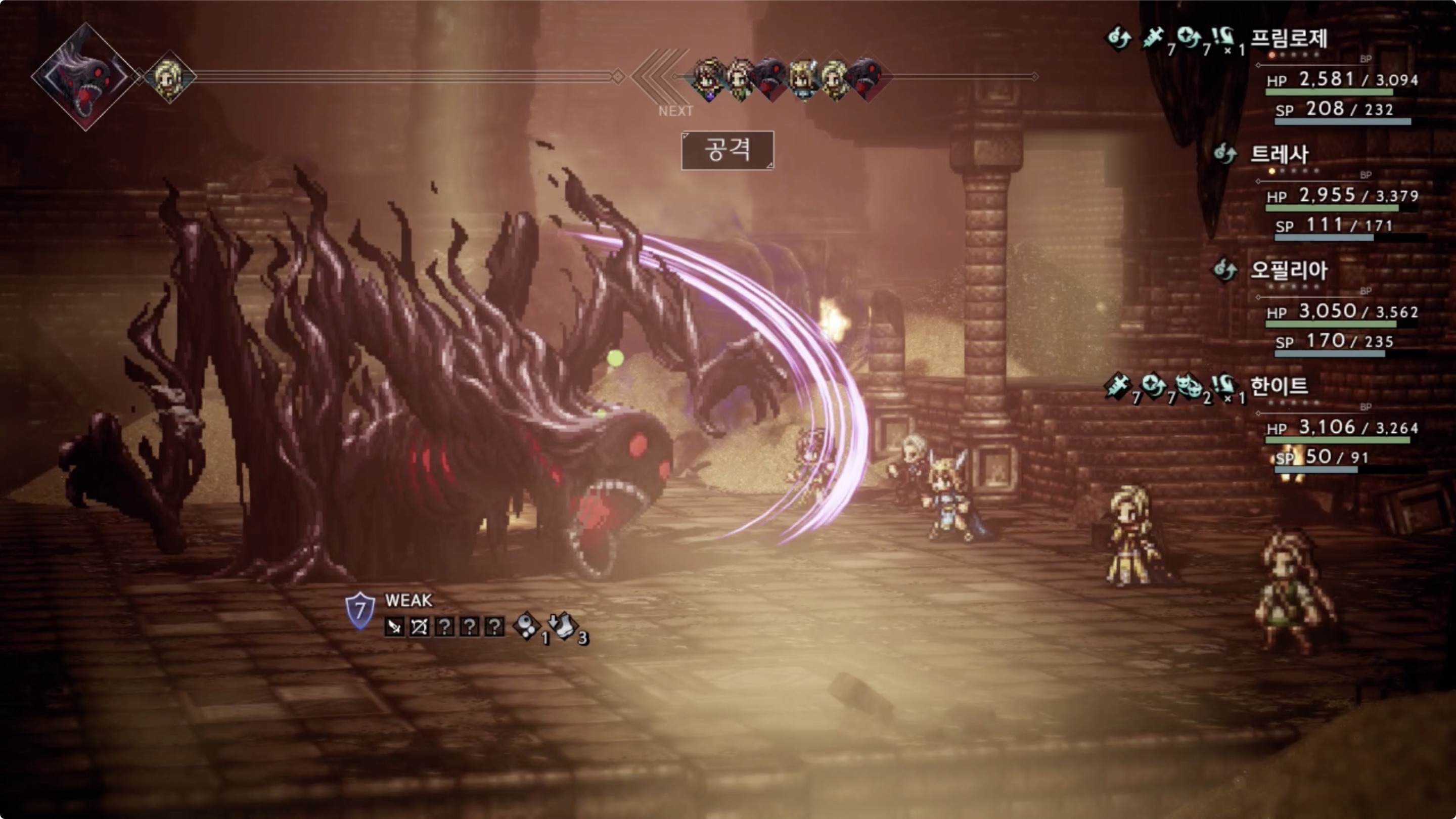 모든 보스전에서 공통적으로 가지고 있는 기본 기술중 하나인 단일 대상을 공격하는 「공격」