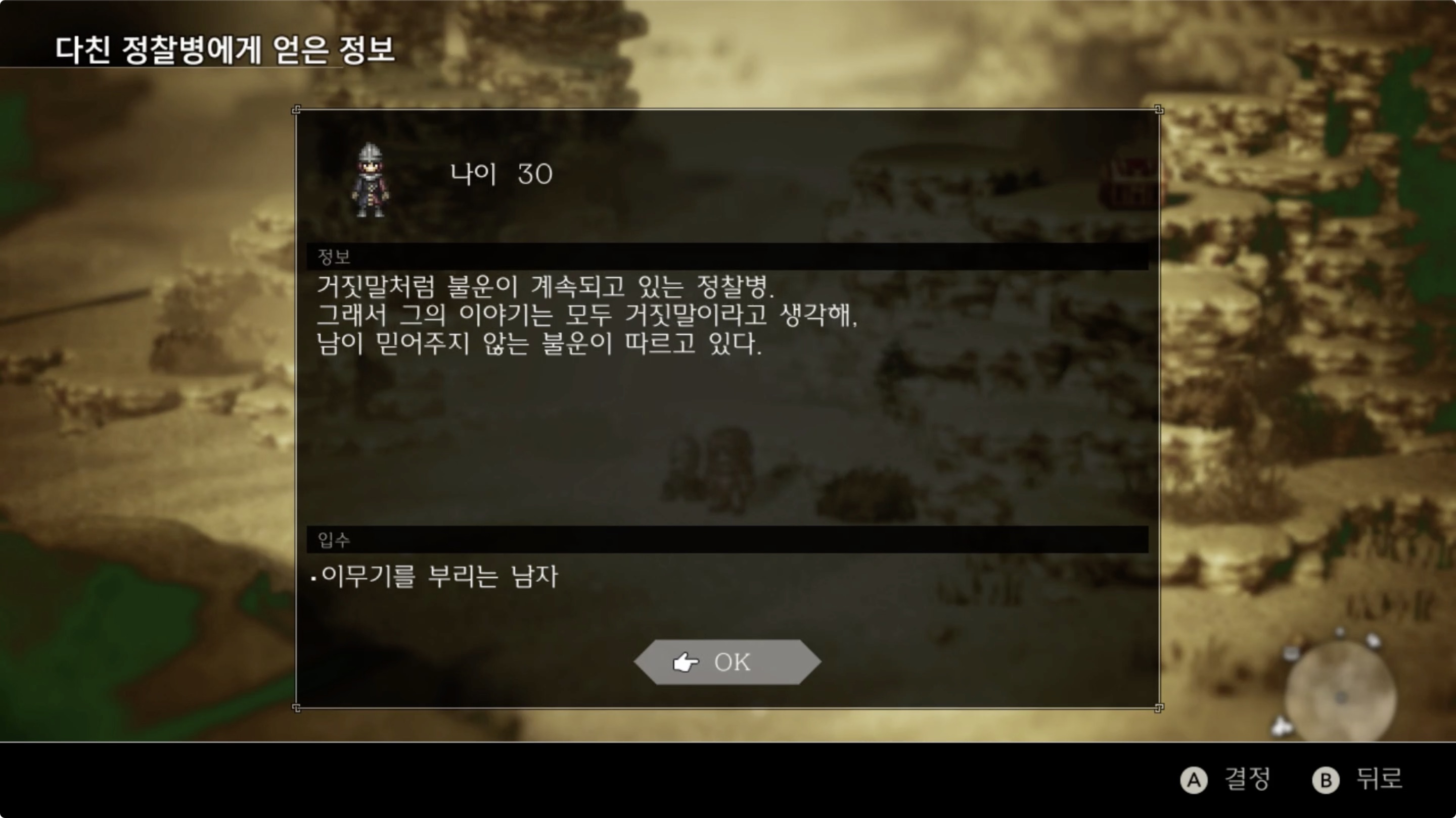 01. (마을 동쪽 출구) '북 웰스프링 모랫길'에 있는 다친 정찰병에게 [질문/탐색]을 통해 '이무기를 부리는 남자'에 대한 정보 입수