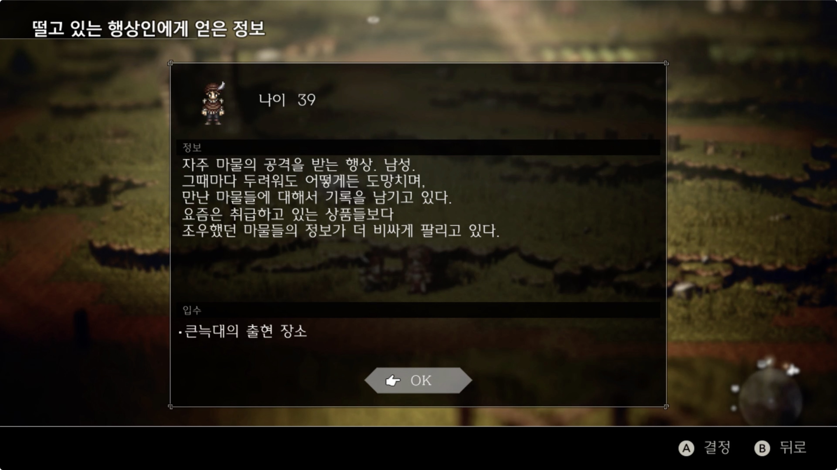01. 서 위스퍼밀 평원의 아래쪽에 있는 '떨고 있는 행상인'에게 [탐색/질문]을 통해 '큰 늑대의 출현 장소'에 관한 정보를 입수한다