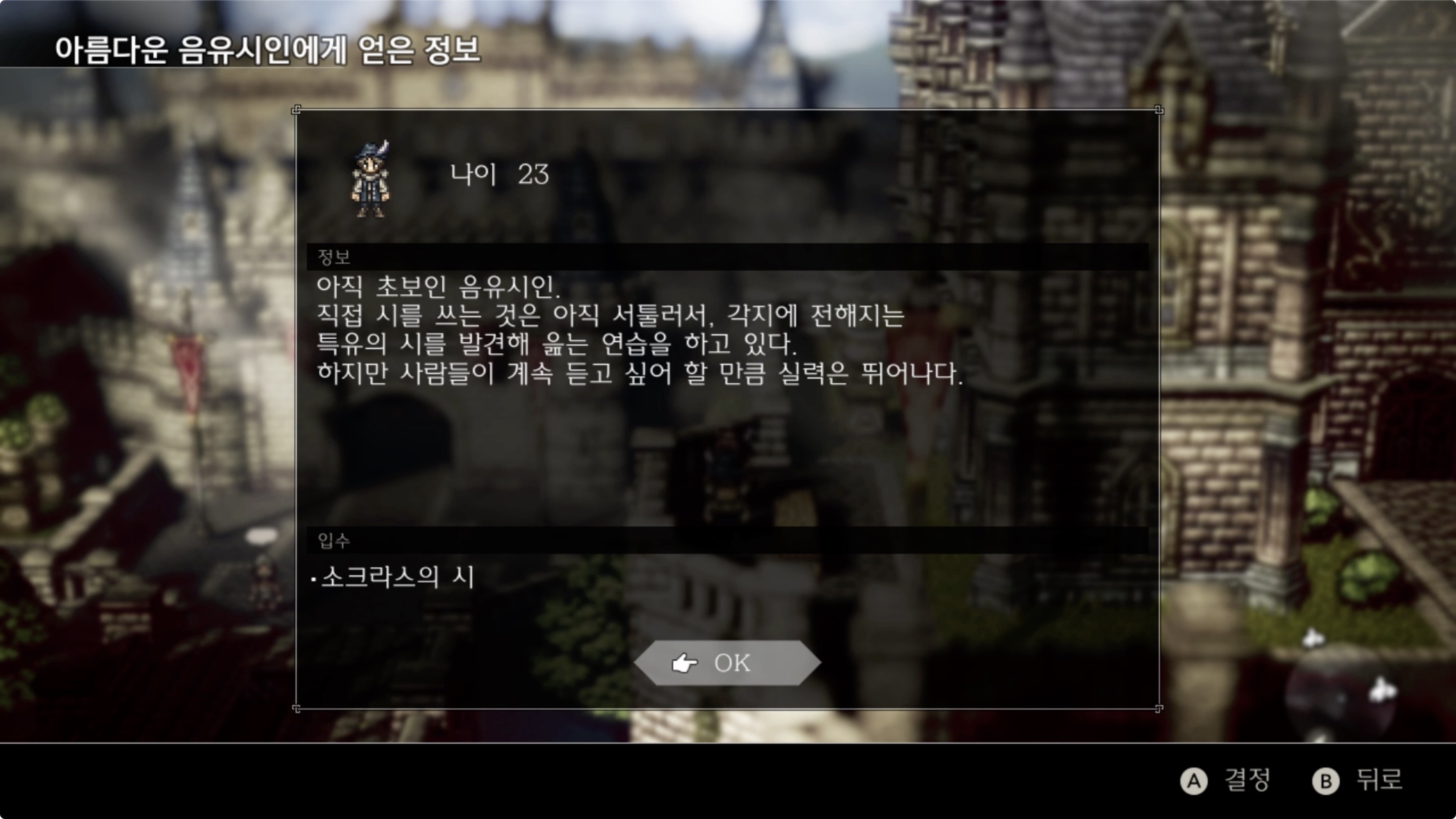 01. 아틀라스담 -왕성 앞-에서 '아름다운 음유시인'에게 [질문/탐색]을 이용해 '소크라스의 시' 정보를 입수