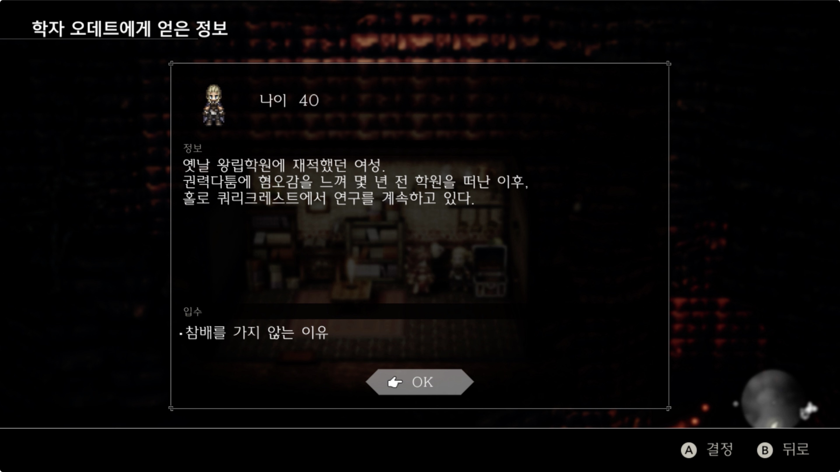 01. 쿼리크레스트 집 안에 있는 '학자 오데트'에게 [질문/탐색]을 이용해, '참배를 가지 않는 이유' 정보를 입수