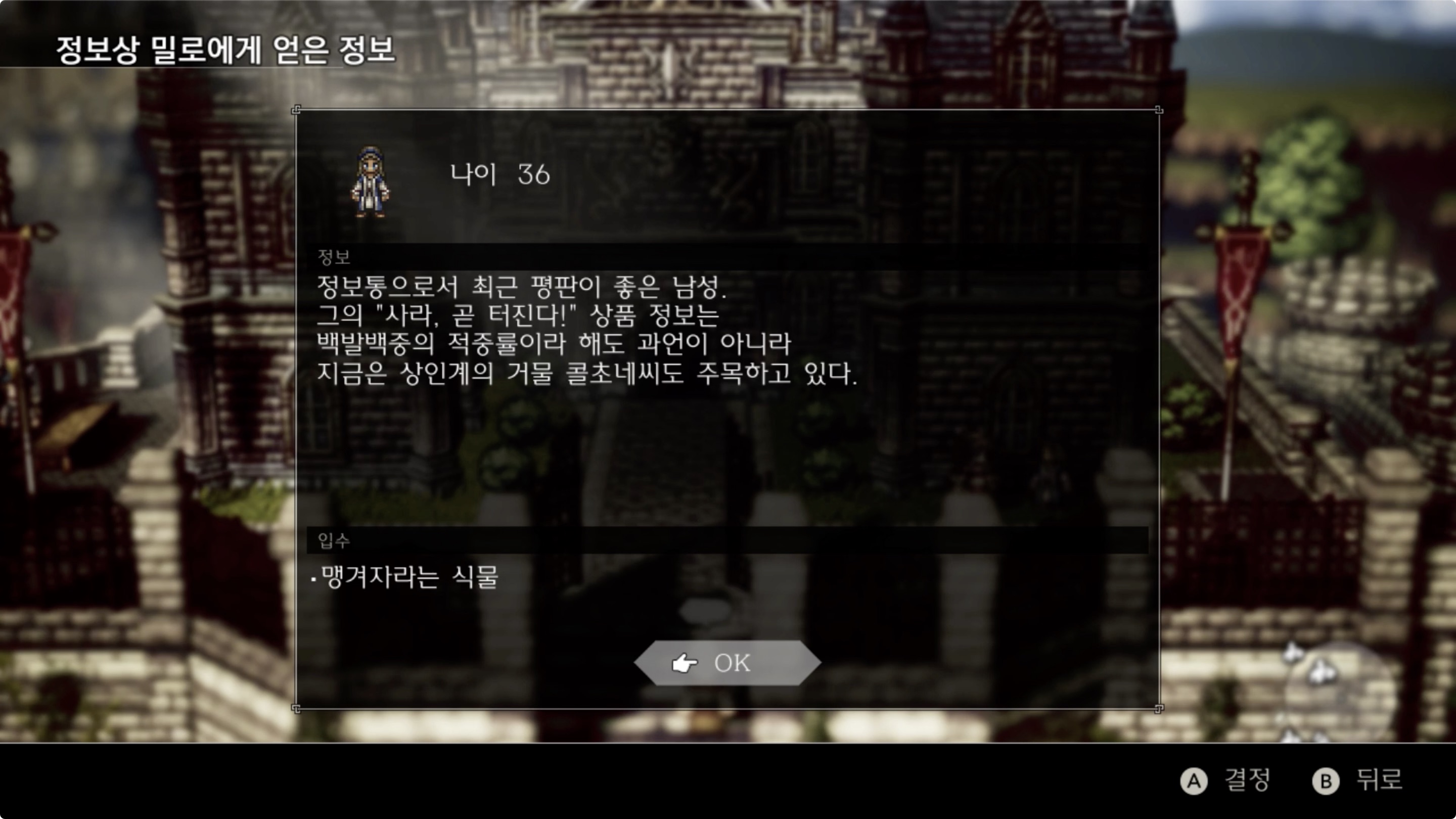 01. 아틀라스담 -왕성 앞-의 '왕립학원' 앞에 있는 '정보상 밀로'에게 [질문/탐색]으로 '맹겨자라는 식물' 정보를 입수
