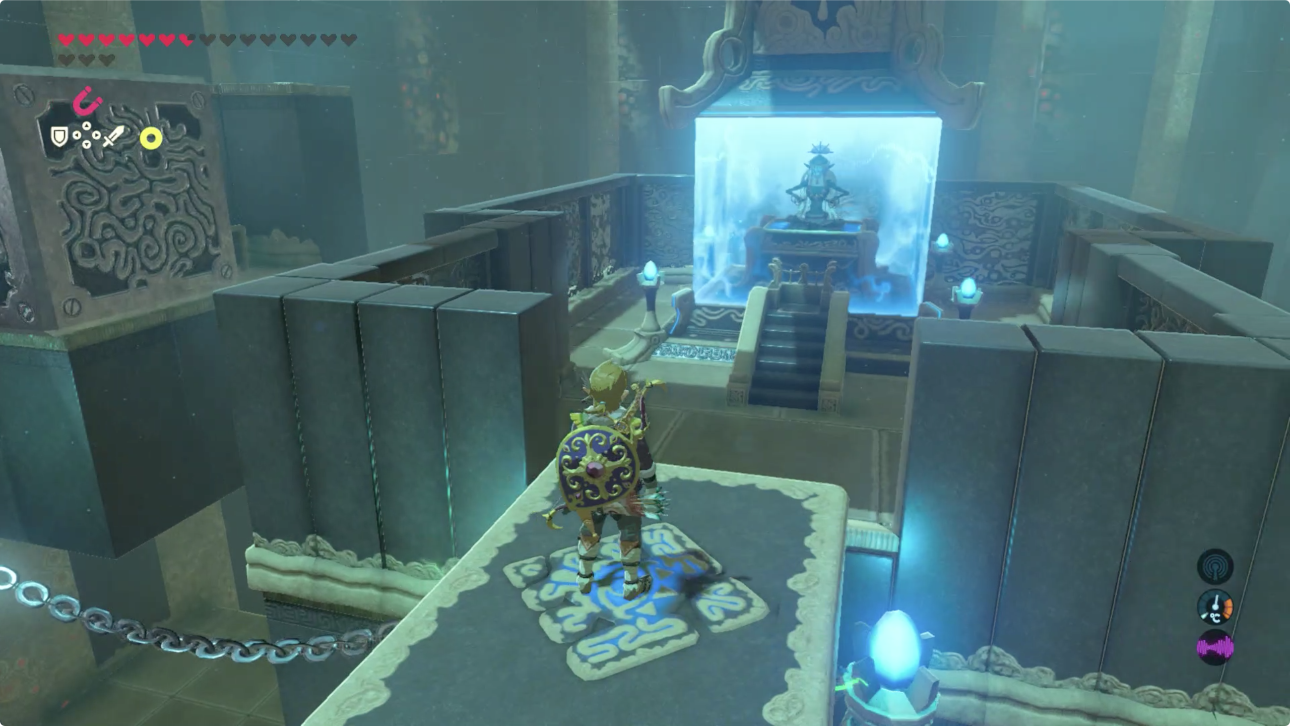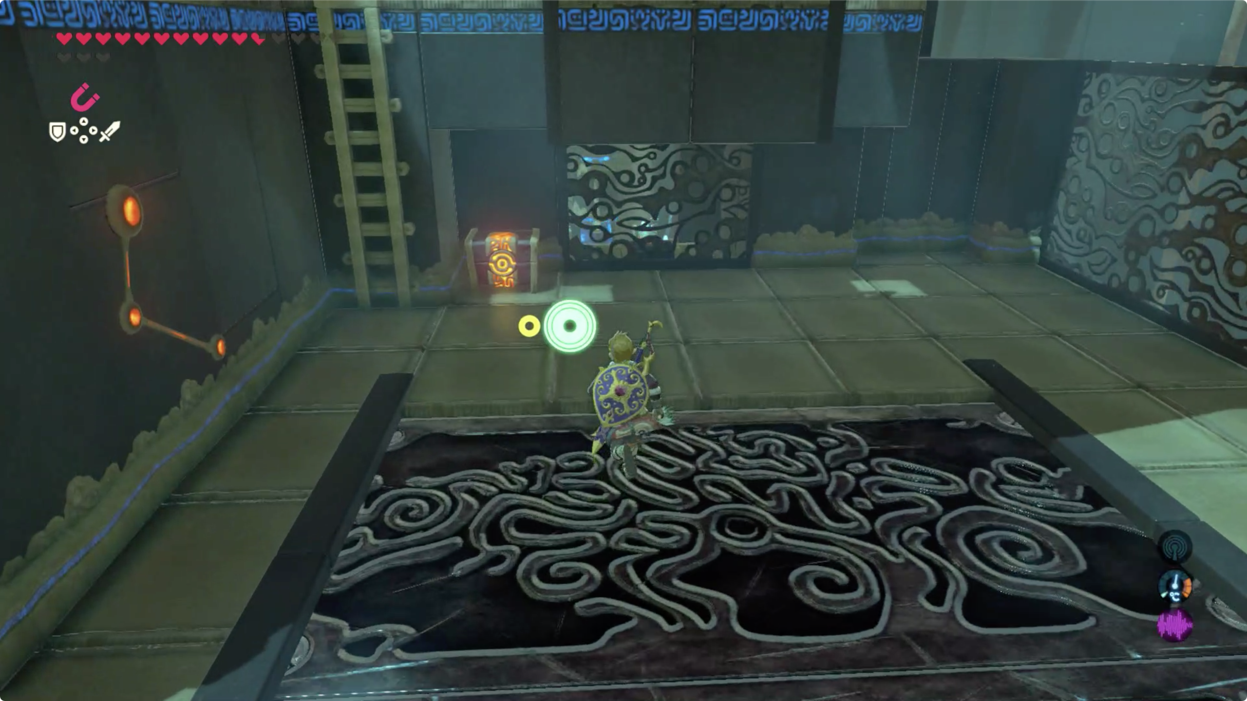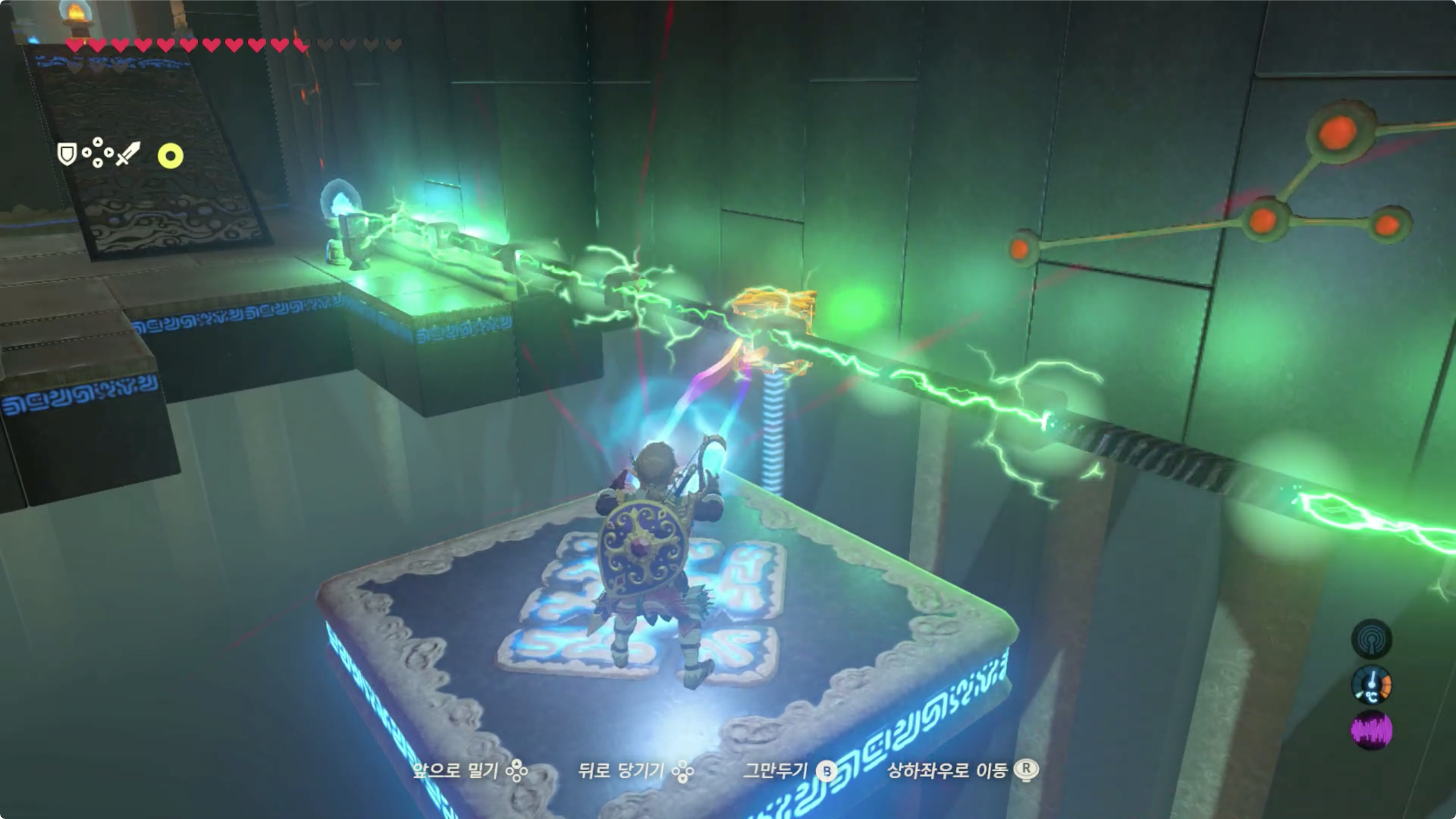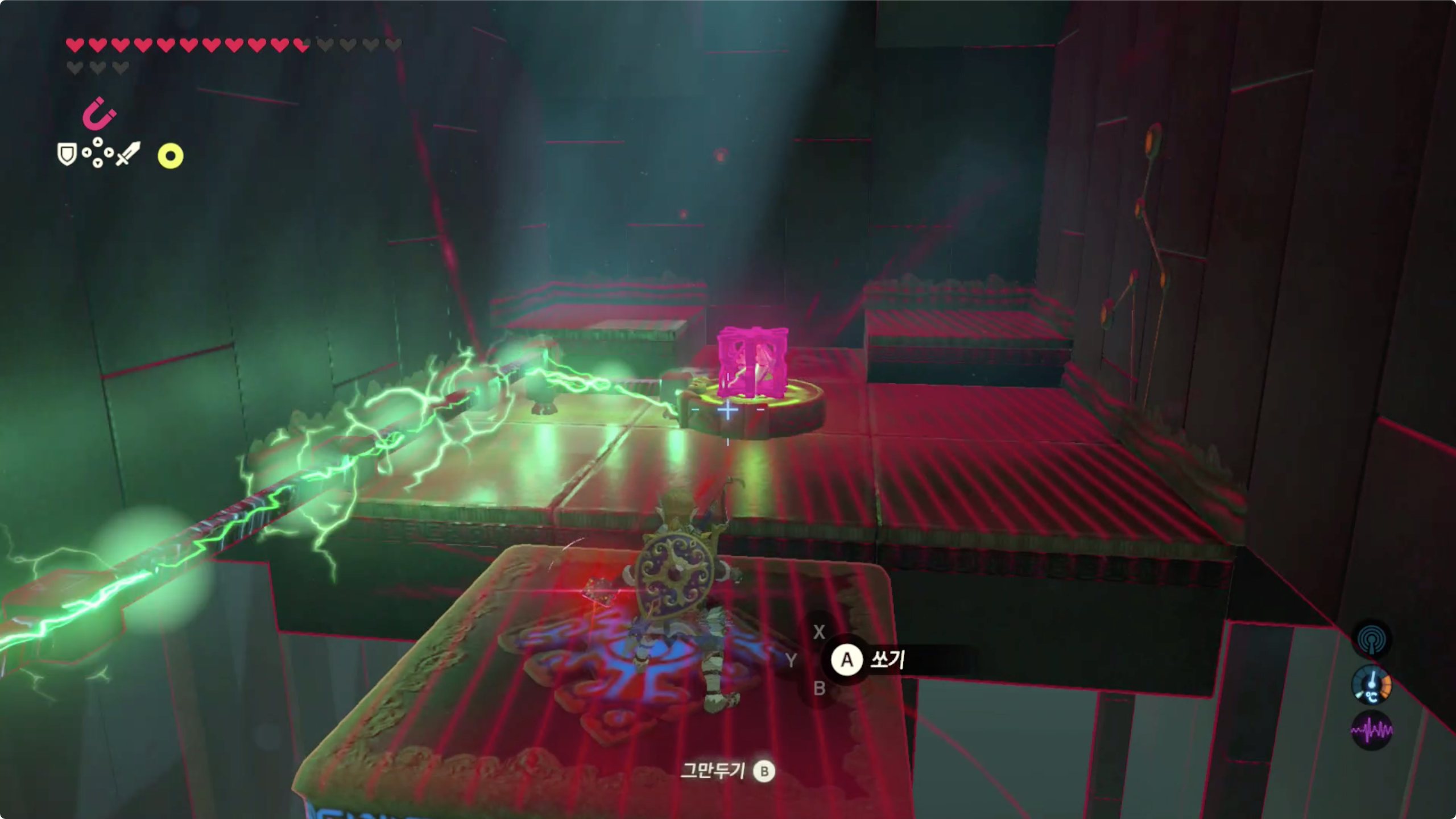 큐브를 장치에 올려놓으면 전기가 흐르면서 잠시 기다리면 출구쪽에서 발판이 다가온다. 발판을 타고 앞으로 진행하다보면 철로된 상자가 방해가 되는데 이건 마그넷 캐치로 밀어내면 된다. (뒤에 보물상자가 있으니 바로 내리지 말고 한번더 왕복하자.)