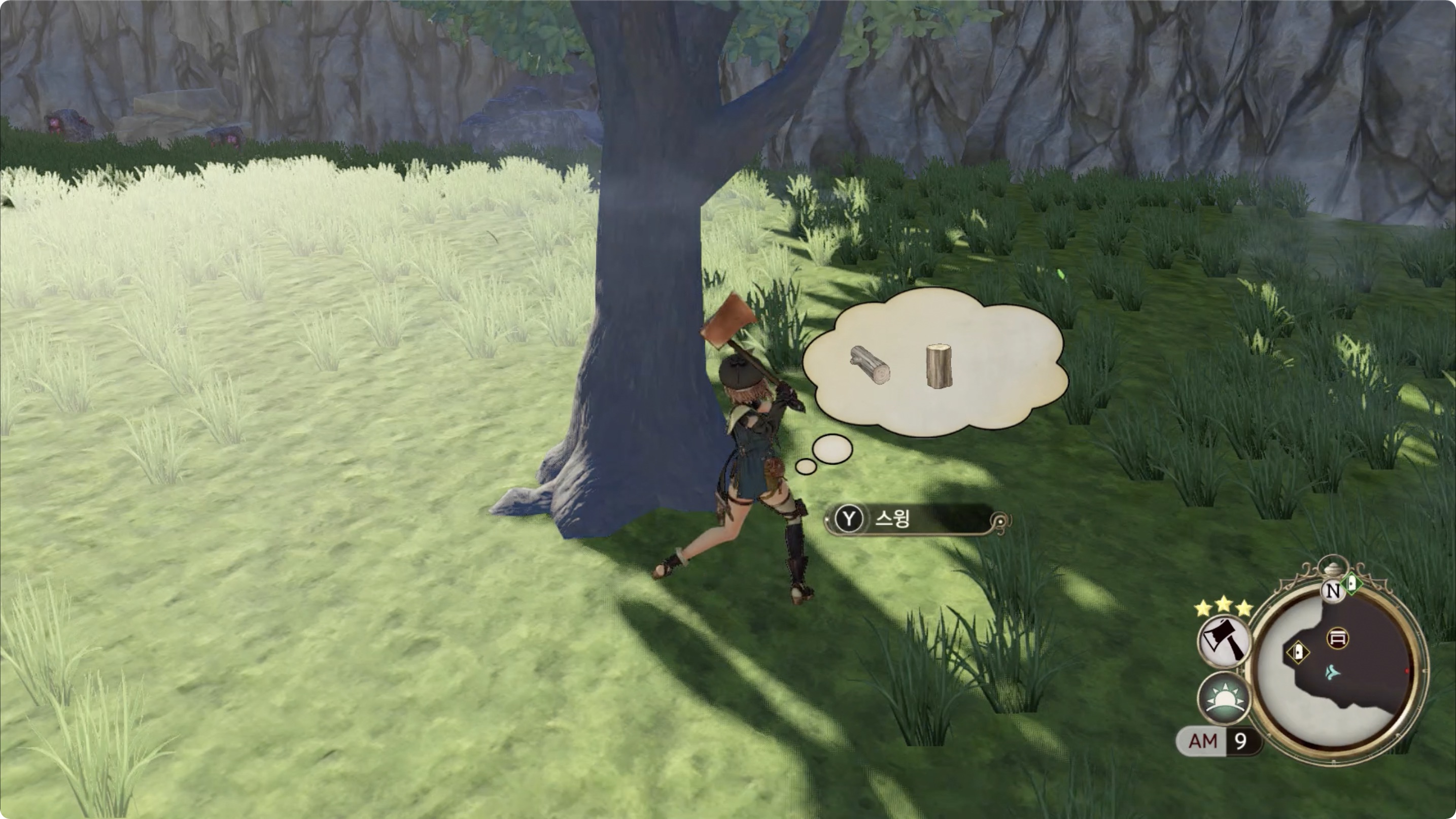 나무를 장작용 도끼로 스윙 (장작용 도끼 Lv2)
