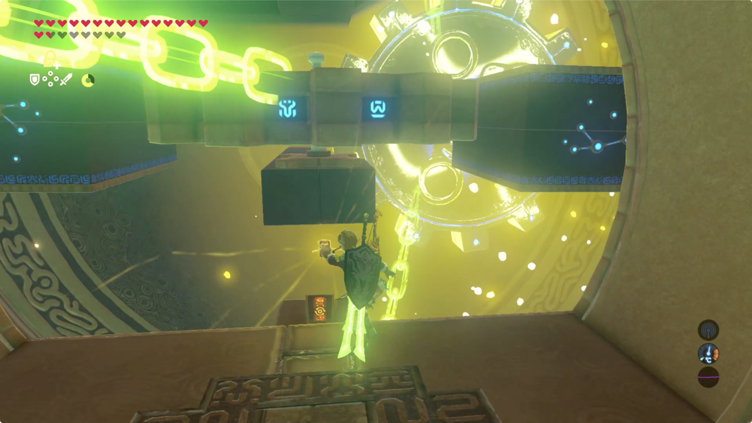 기둥중 하나가 중간의 끊어진 계단 역할을 하고 있으니 기다렸다가 타이밍 봐서 톱니바퀴를 멈춰 준 후 지나가면 사당 챌린지는 완료됩니다.