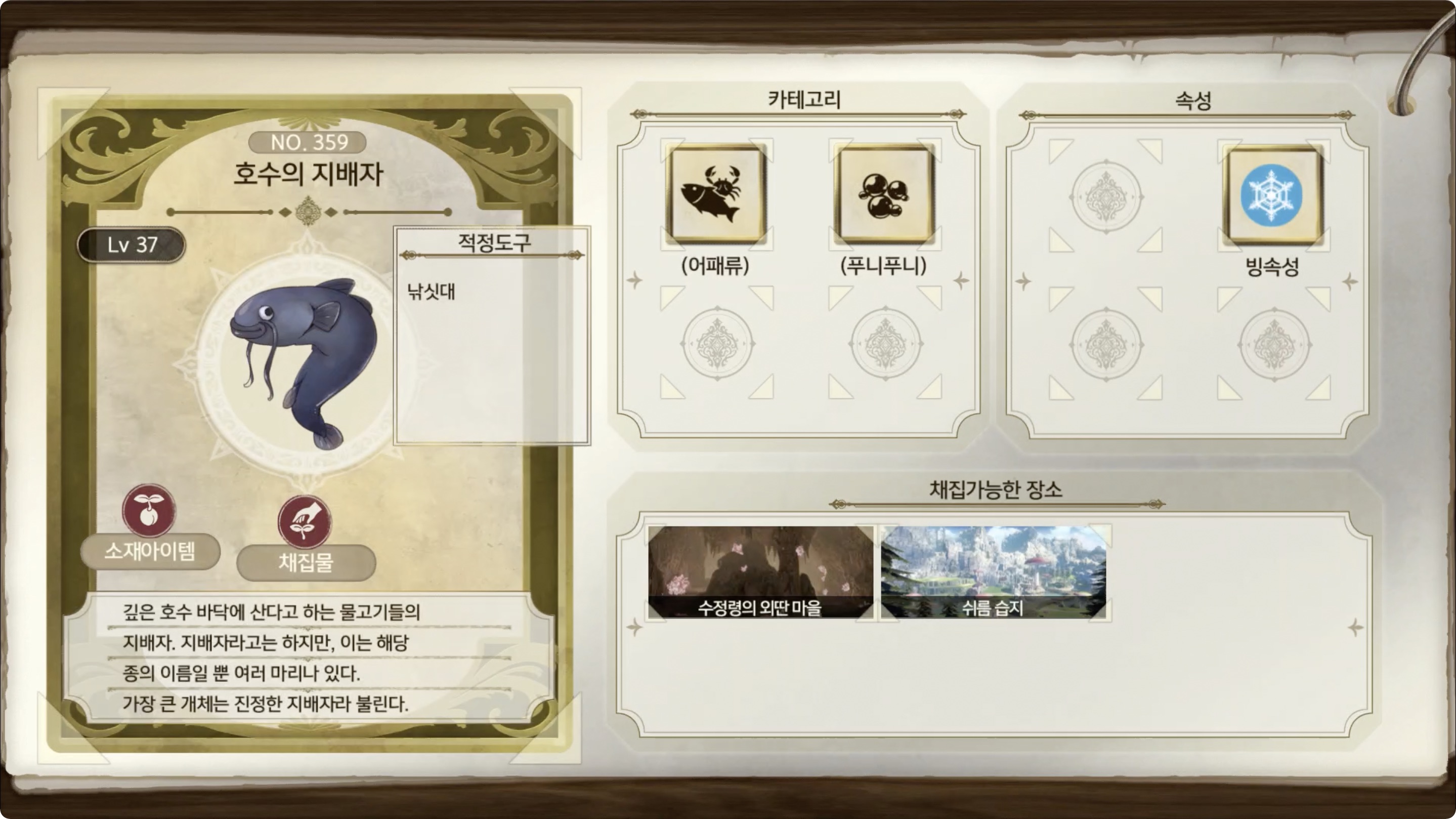 3개의 낚시 포인트중 동쪽 낚시 포인트 2개에서 입수 가능 (낚싯대 랭크3)