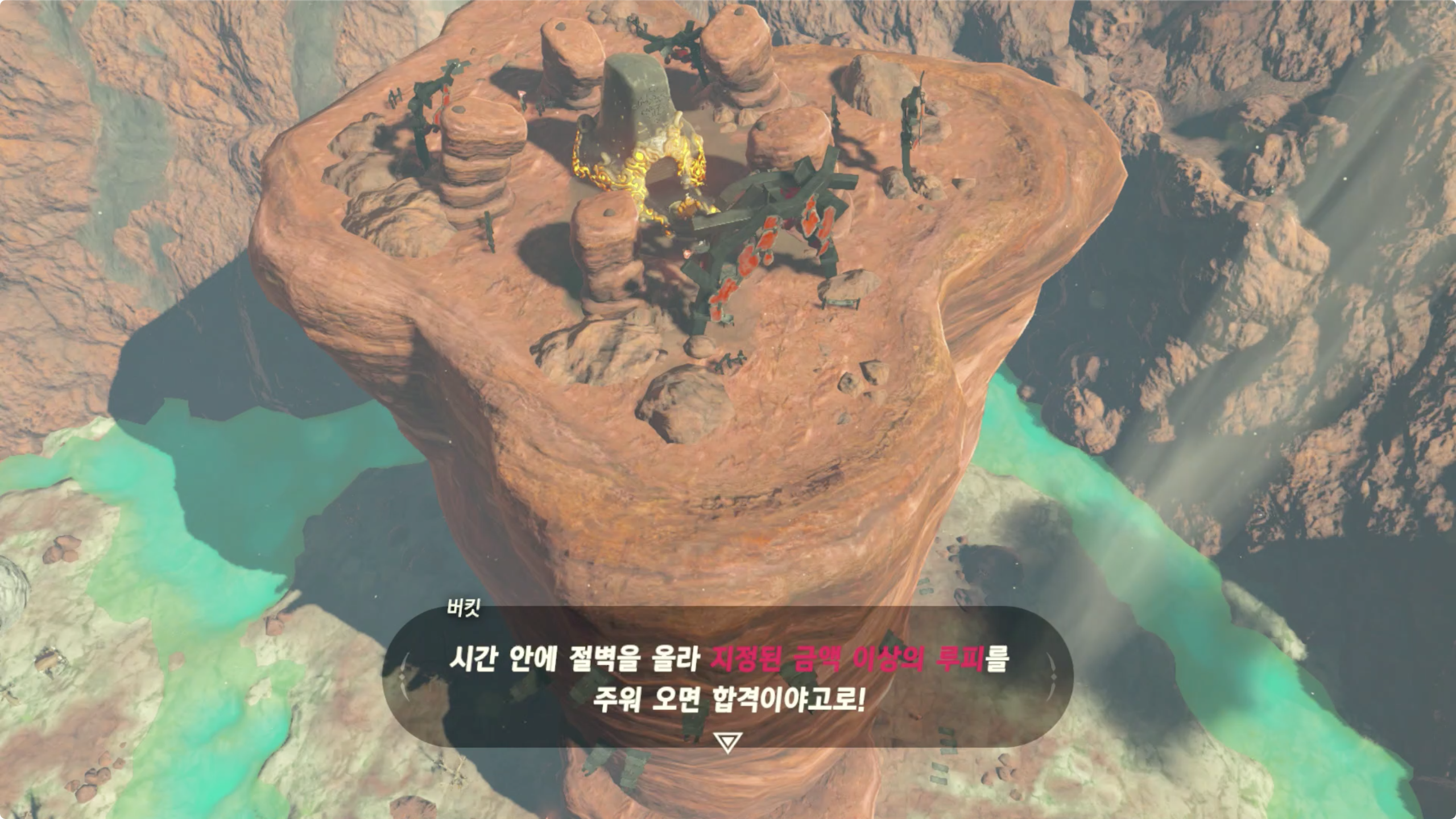사당에 들어가기위해선 절벽 오르기 미니 게임을 해야하는데 올라 오면서 100 루피 이상을 모아야 한다.