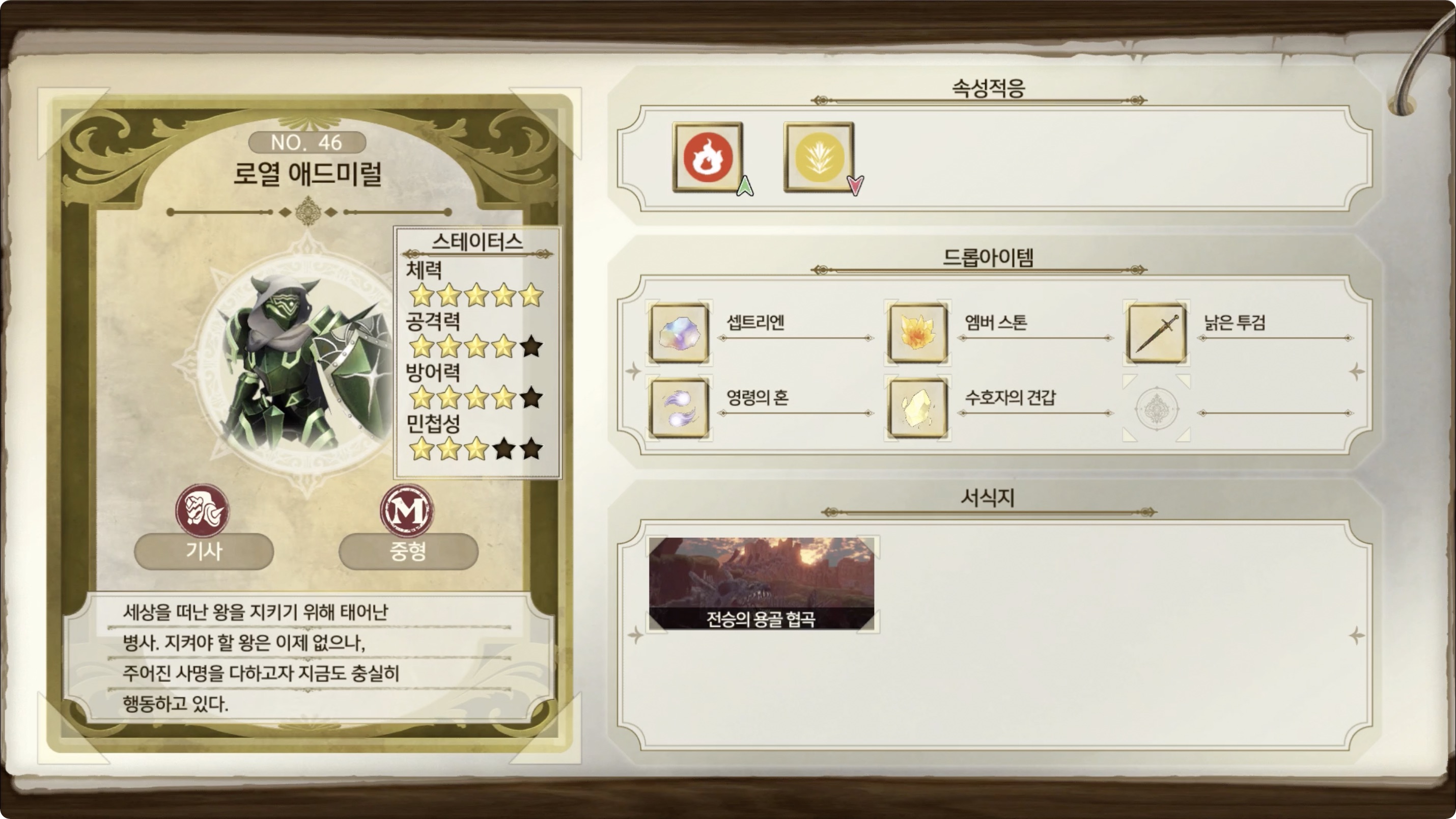 체력 : ★★★★★ / 공격력 : ★★★★☆ / 방어력 : ★★★★☆ / 민첩성 : ★★★☆☆