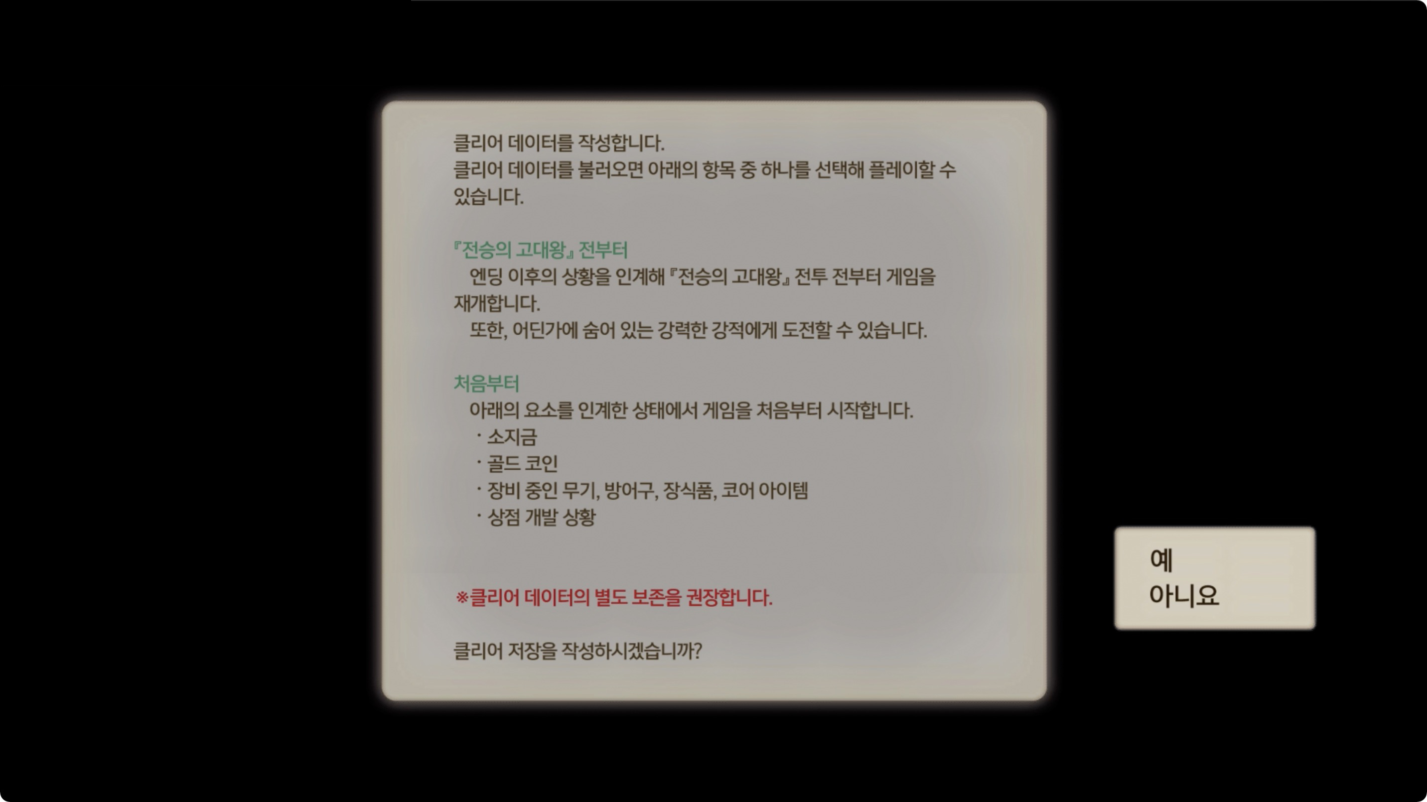 클리어 데이터를 불러오면 아래의 항목 중 하나를 선택해 플레이할 수 있습니다.