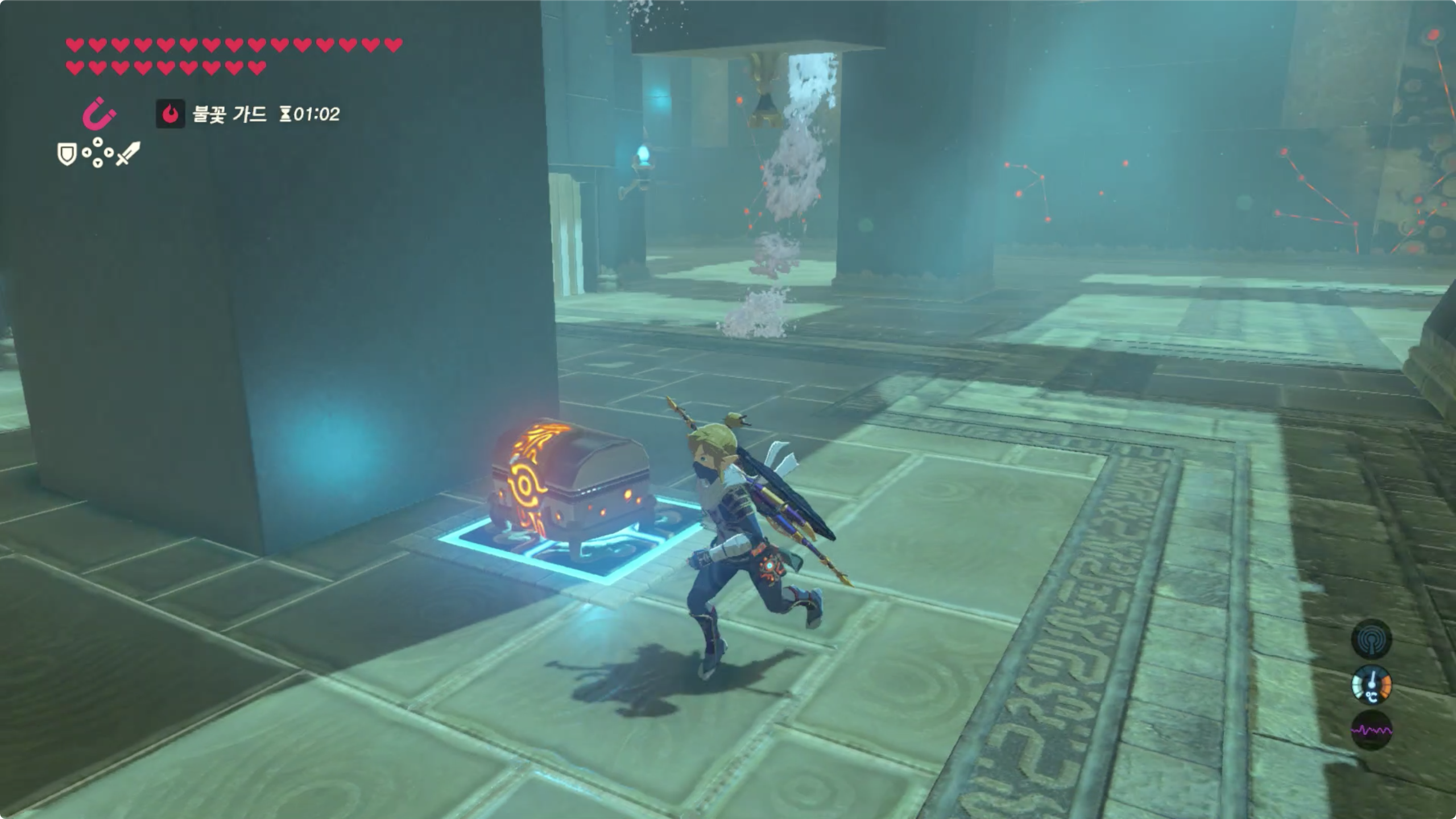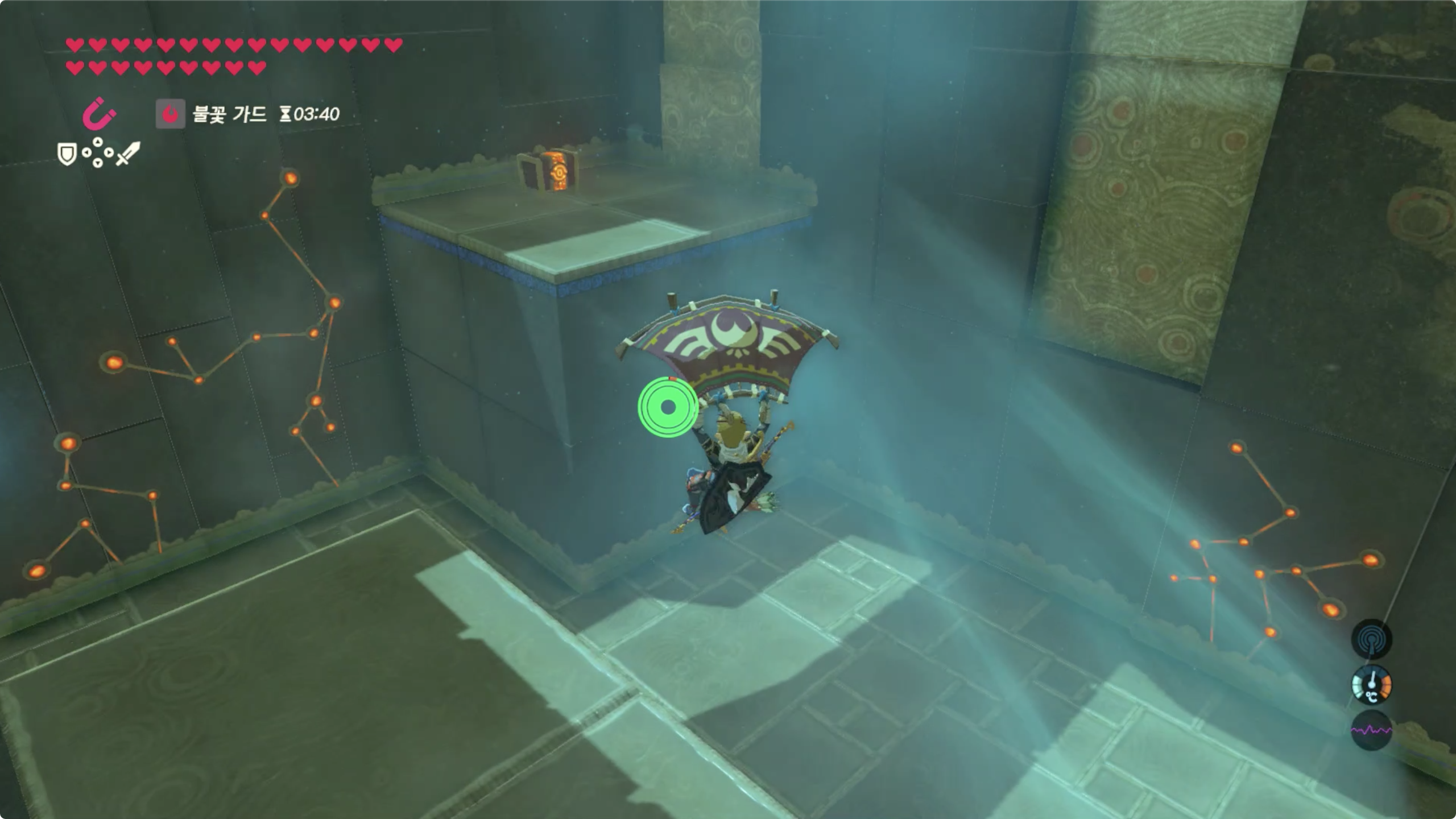 남은 보물상자는 마그넷 캐치를 이용해 왼쪽 스위치 위에 올려주자.