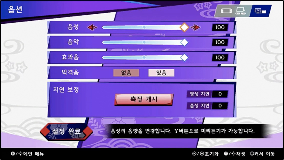 음성, 음악, 효과음 음량 조정과 박격음 유무 선택, 영상과 음성의 지연 보정을 할 수 있습니다.