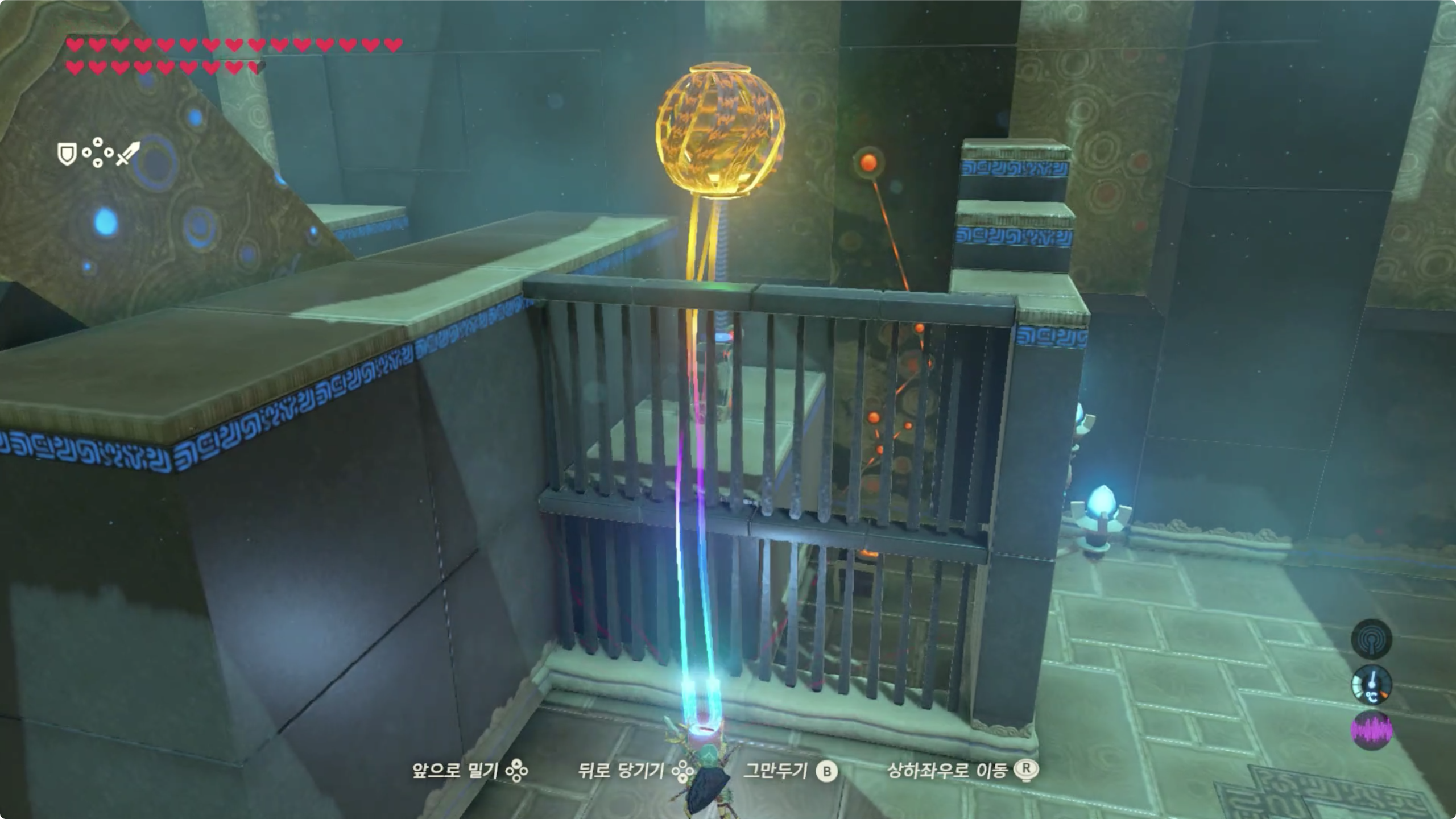 사당에 입장하면 좌 우로 왔다 갔다 하는 구슬이 있는데 이걸 타임 록으로 멈춘 후 아래쪽으로 떨어뜨려 주자.