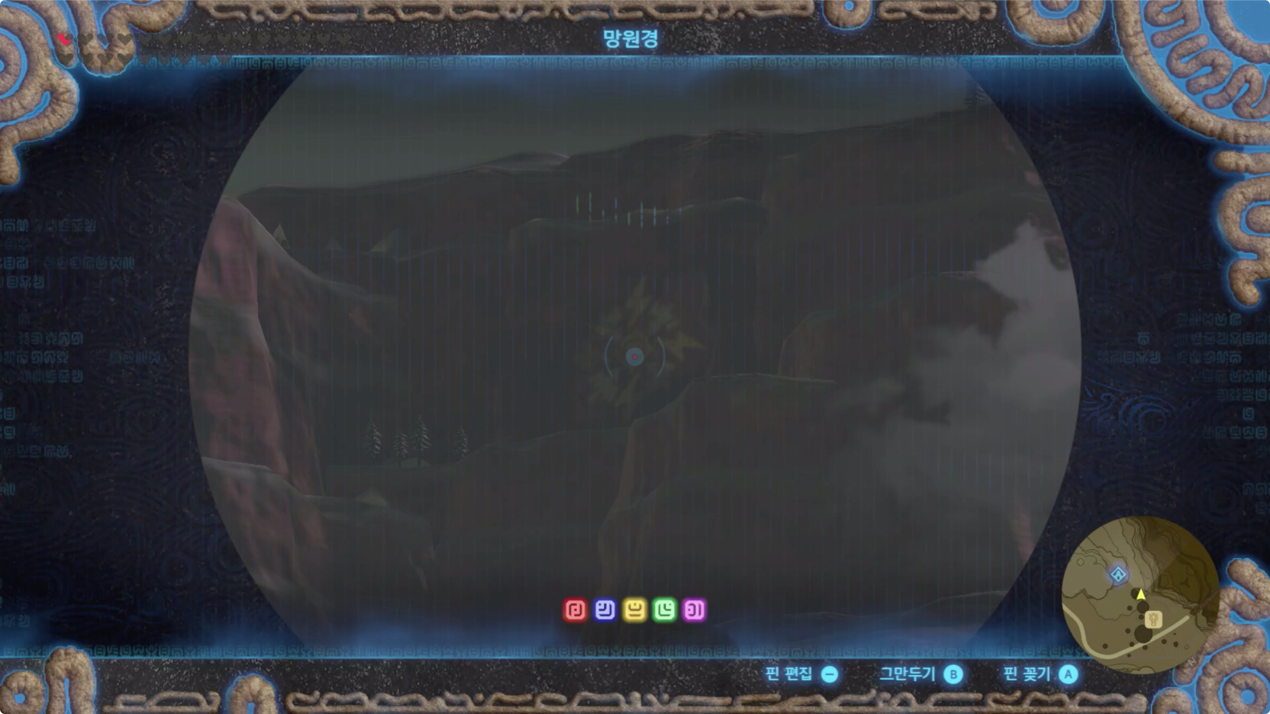 망원경으로 보면 절벽에 문양이 세겨져 있는 곳이 있는데 저곳으로 가야하니 마커를 찍고 마커를 따라 이동하자.