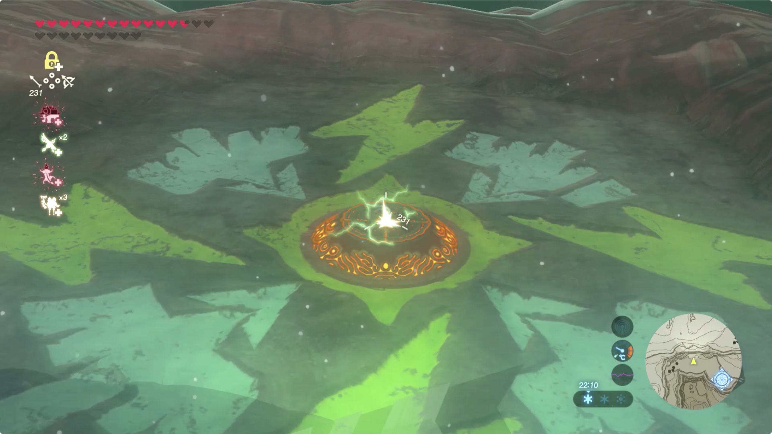 도착하면 절벽 중앙에 빛나는 제단과 주변에 활과 번개 모양의 마크가 있다.