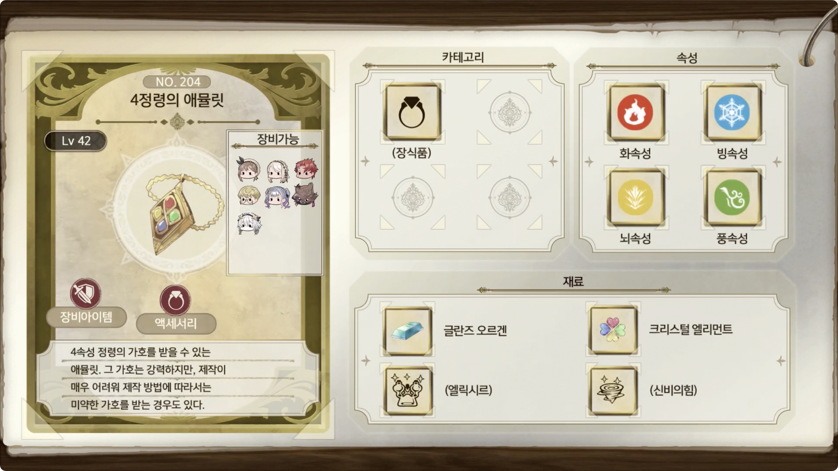 라이자의 아틀리에 2 - 아이템 도감 NO.204 4정령의 애뮬릿
