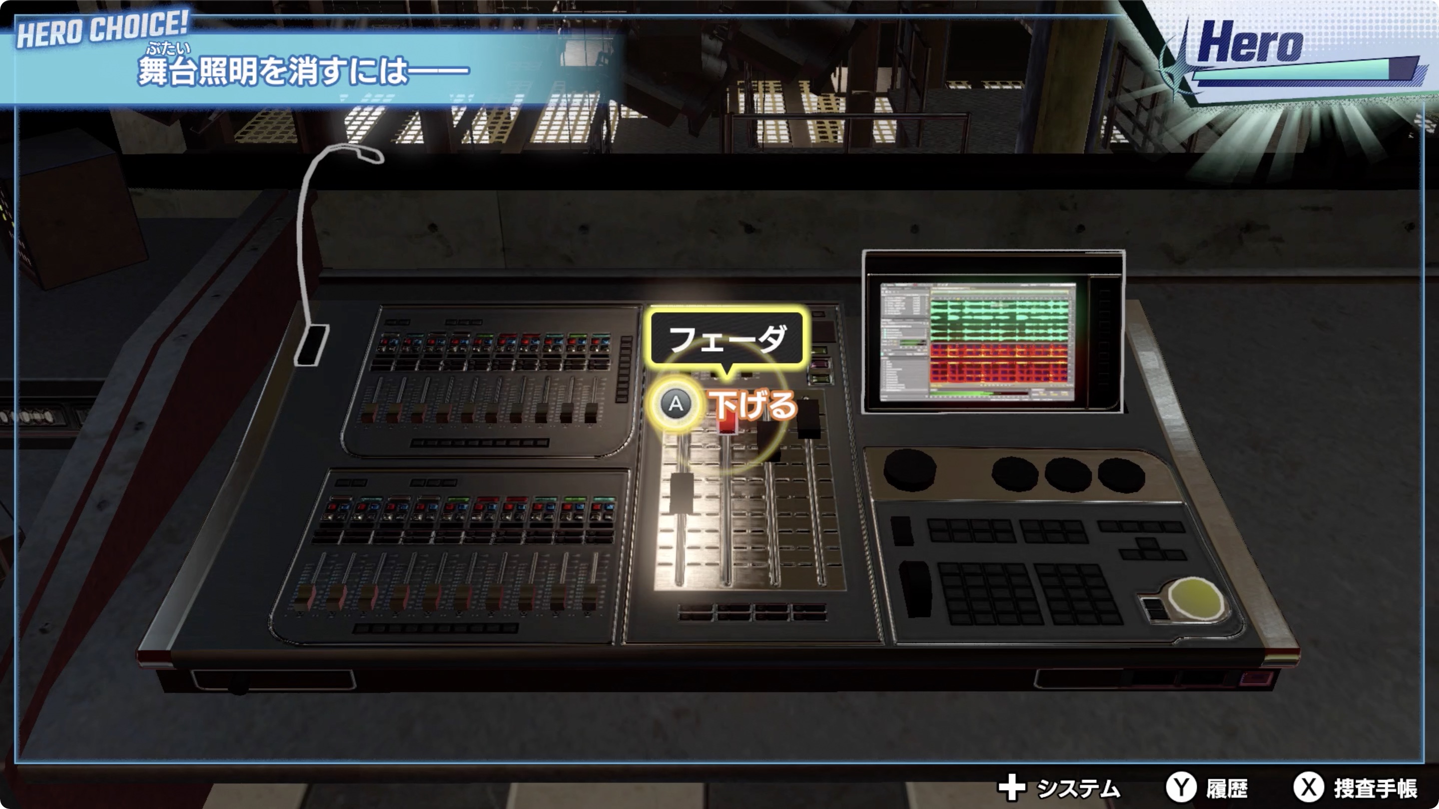 • 調光卓(조명 컨트롤 테이블)을 조사한 후 フェーダ(페이더)를 아래로 내려 조명을 끈다.