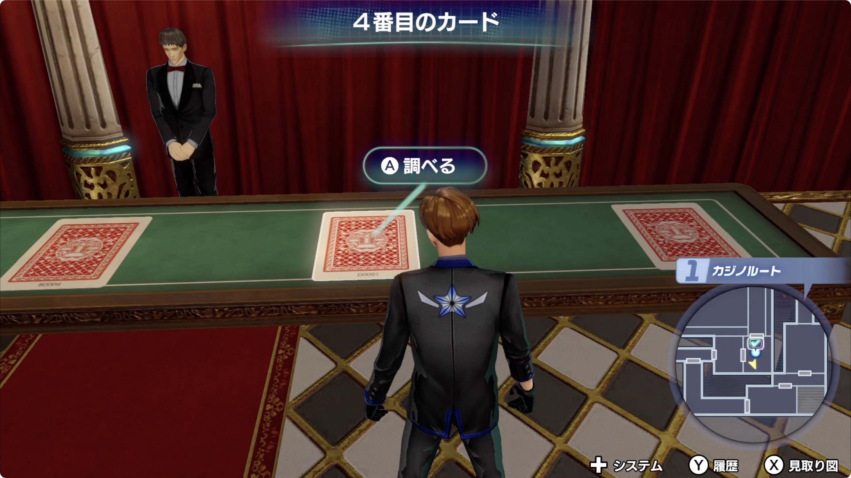 • 모니터 룸에선 가장 왼쪽의 ディーラーの机(딜러의 책상)을 조사한 후, 探す(찾는다)를 선택.