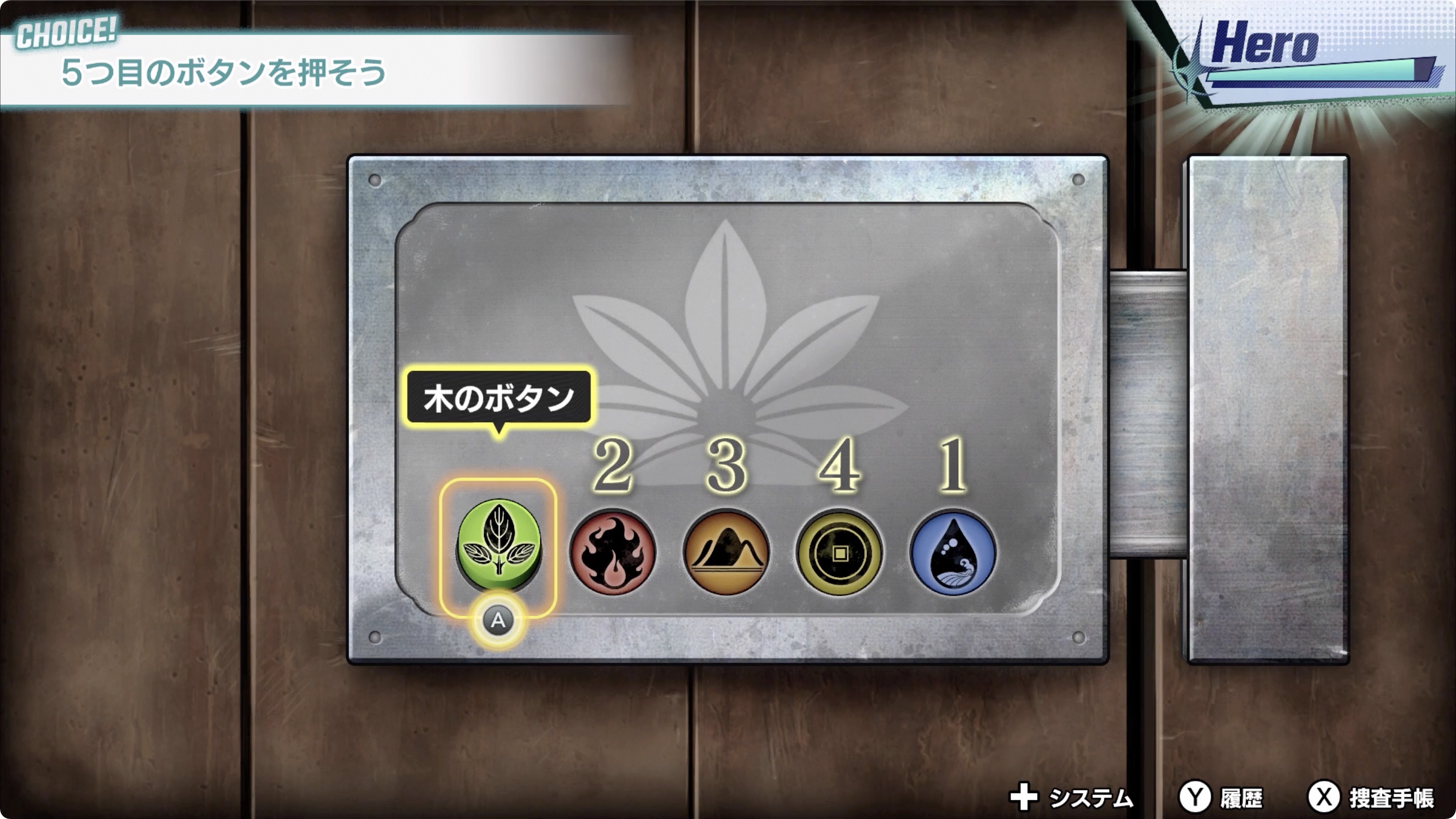 정답 : ① 水のボタン(물의 버튼) ② 火のボタン(불의 버튼) ③ 土のボタン(흙의 버튼) ④ 金のボタン(금의 버튼) ⑤ 木のボタン (나무의 버튼)