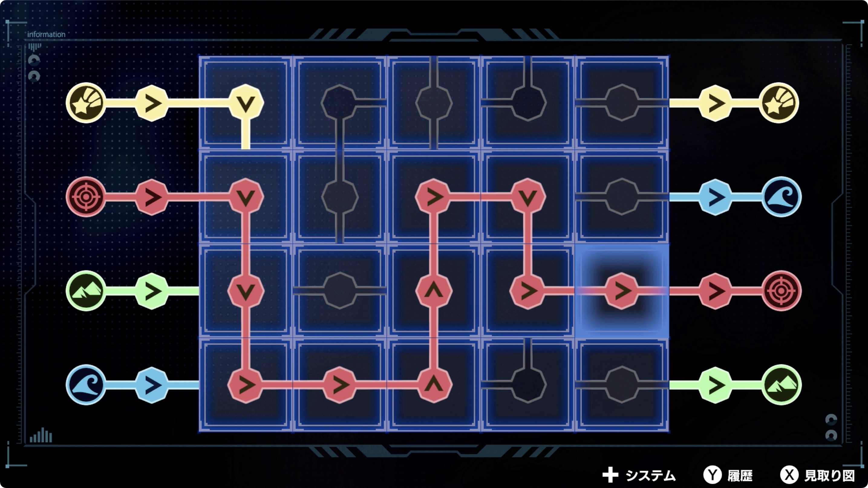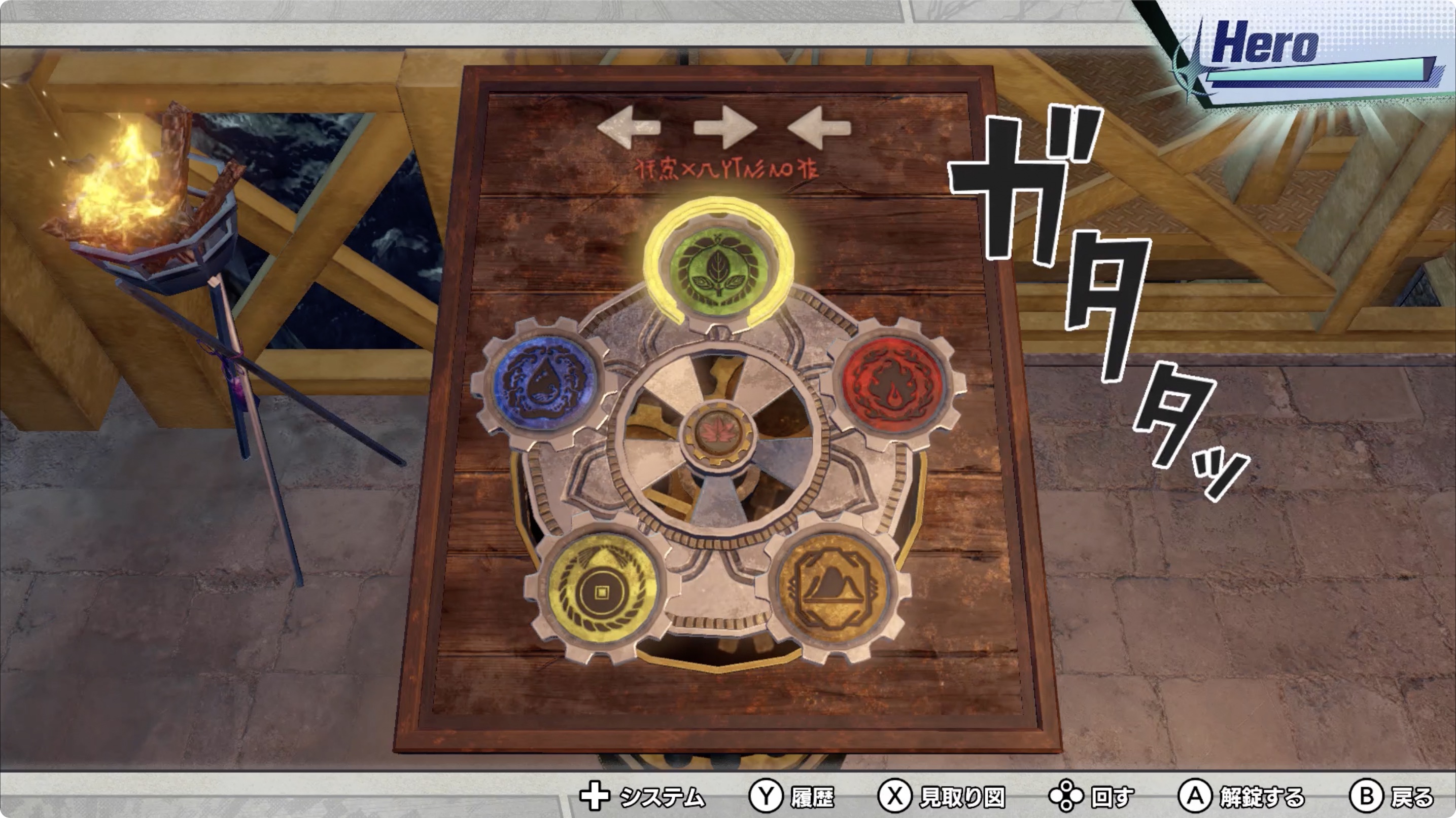 • 중앙의 조작 패널은 왼쪽으로 2칸 돌려 불의 문장을 맞추고, 오른쪽으로 2칸 돌려 물의 문장을 맞춘 후, 왼쪽으로 4칸 돌려 금의 문장을 맞추면 된다. (추가적인 이동을 하게되면 실패하게 된다) 모두 맞췄다면 A 버튼을 눌러 잠금을 풀자.