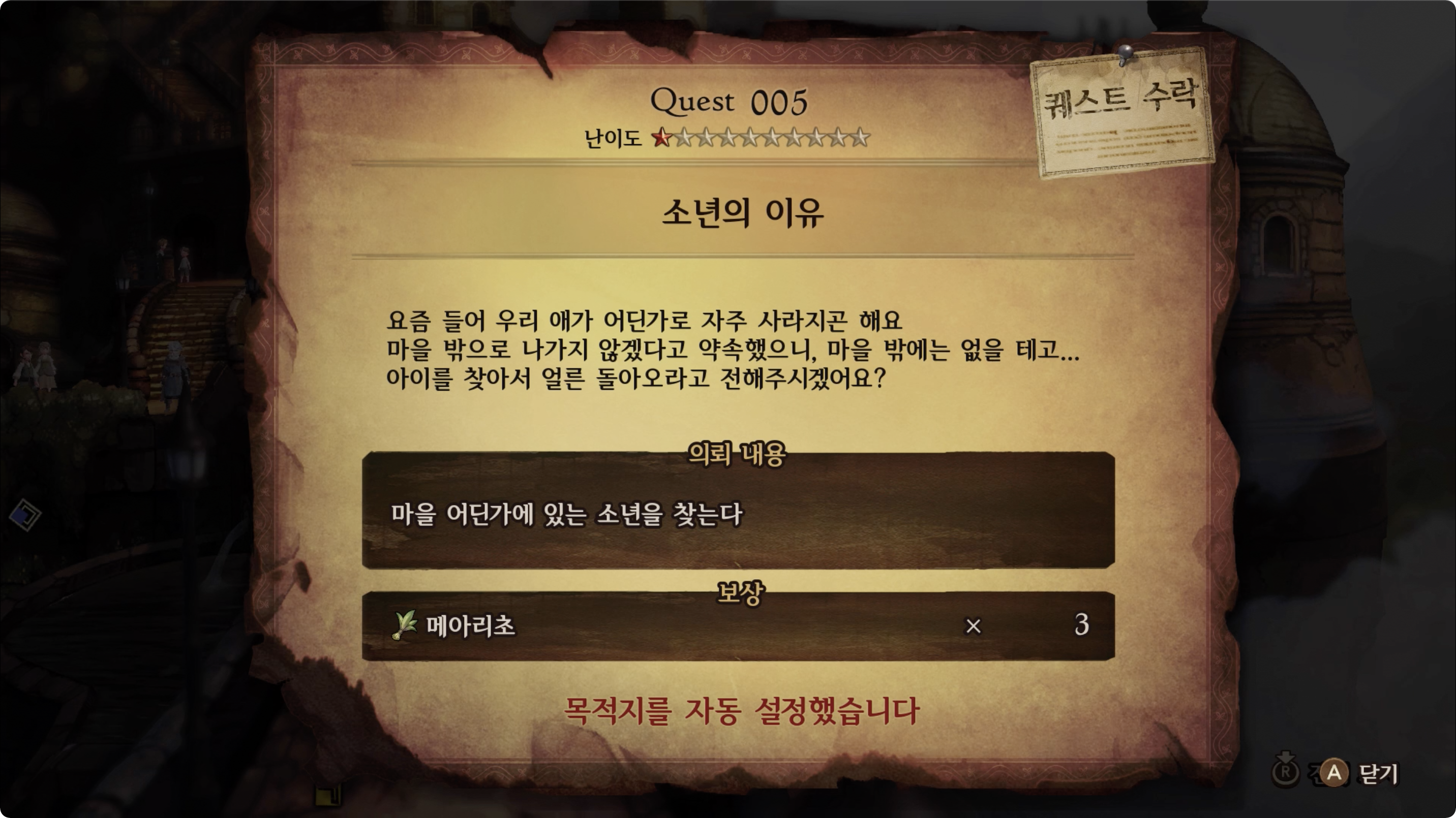 | 의뢰 내용 | 마을 어딘가에 있는 소년을 찾는다 |