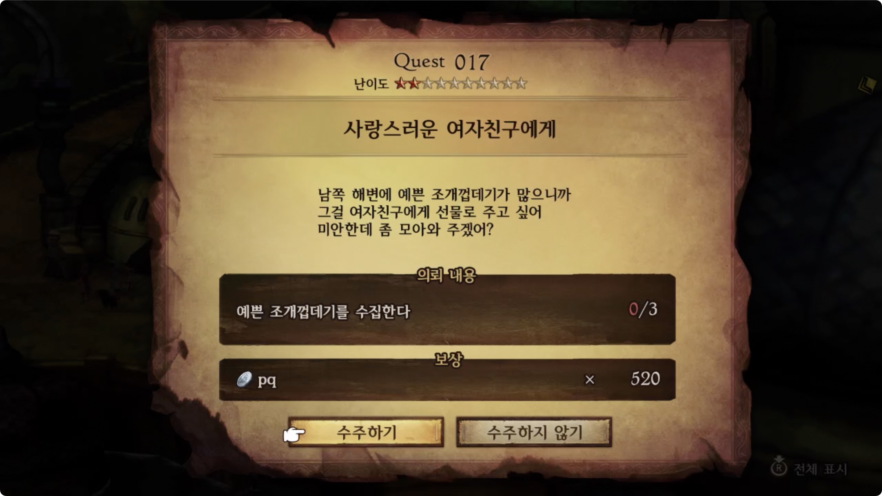 | 의뢰 내용 | 예쁜 조개껍데기를 수집한다 0/3 |