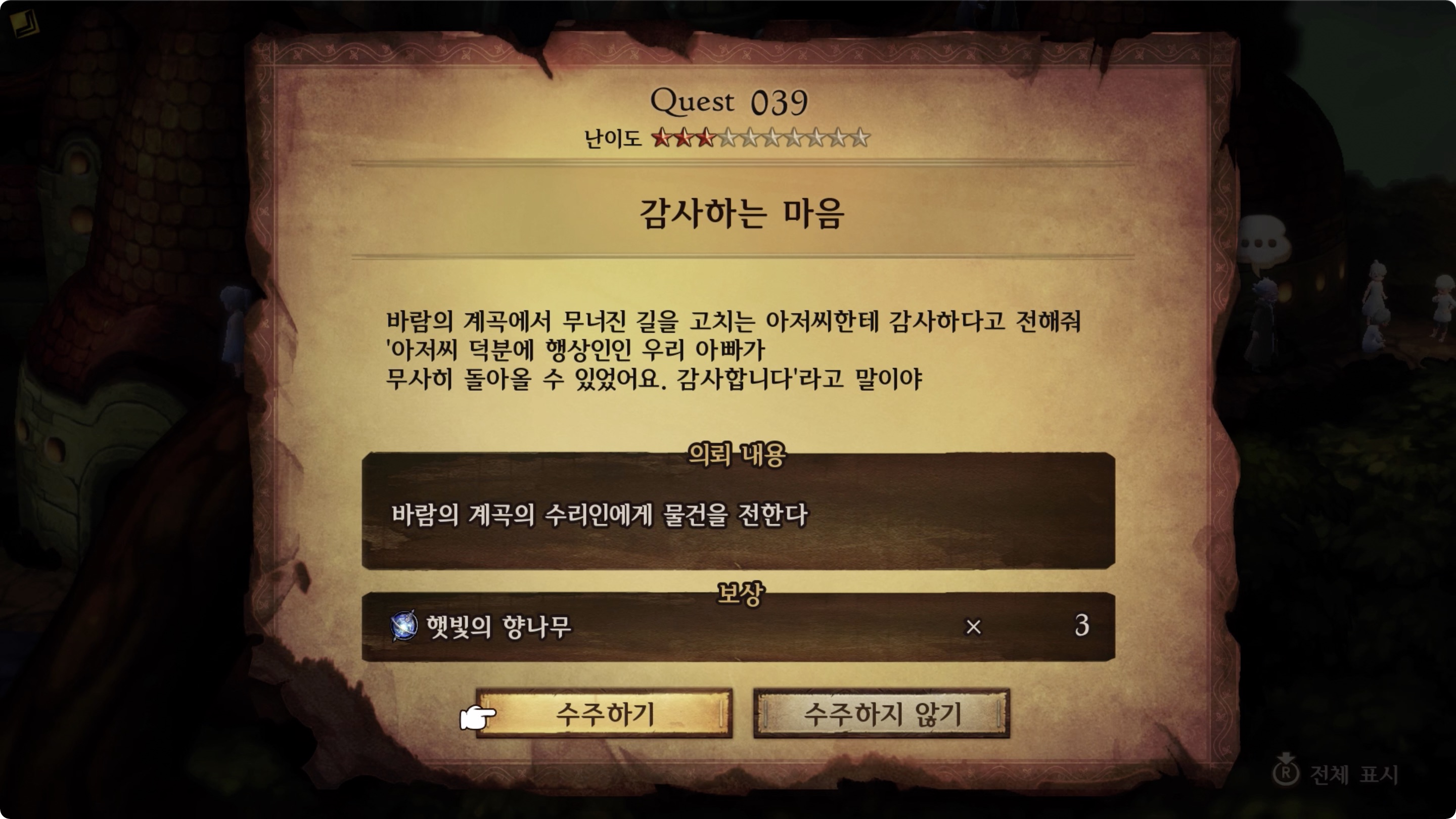 | 의뢰 내용 | 바람의 계곡의 수리인에게 물건을 전한다 |
