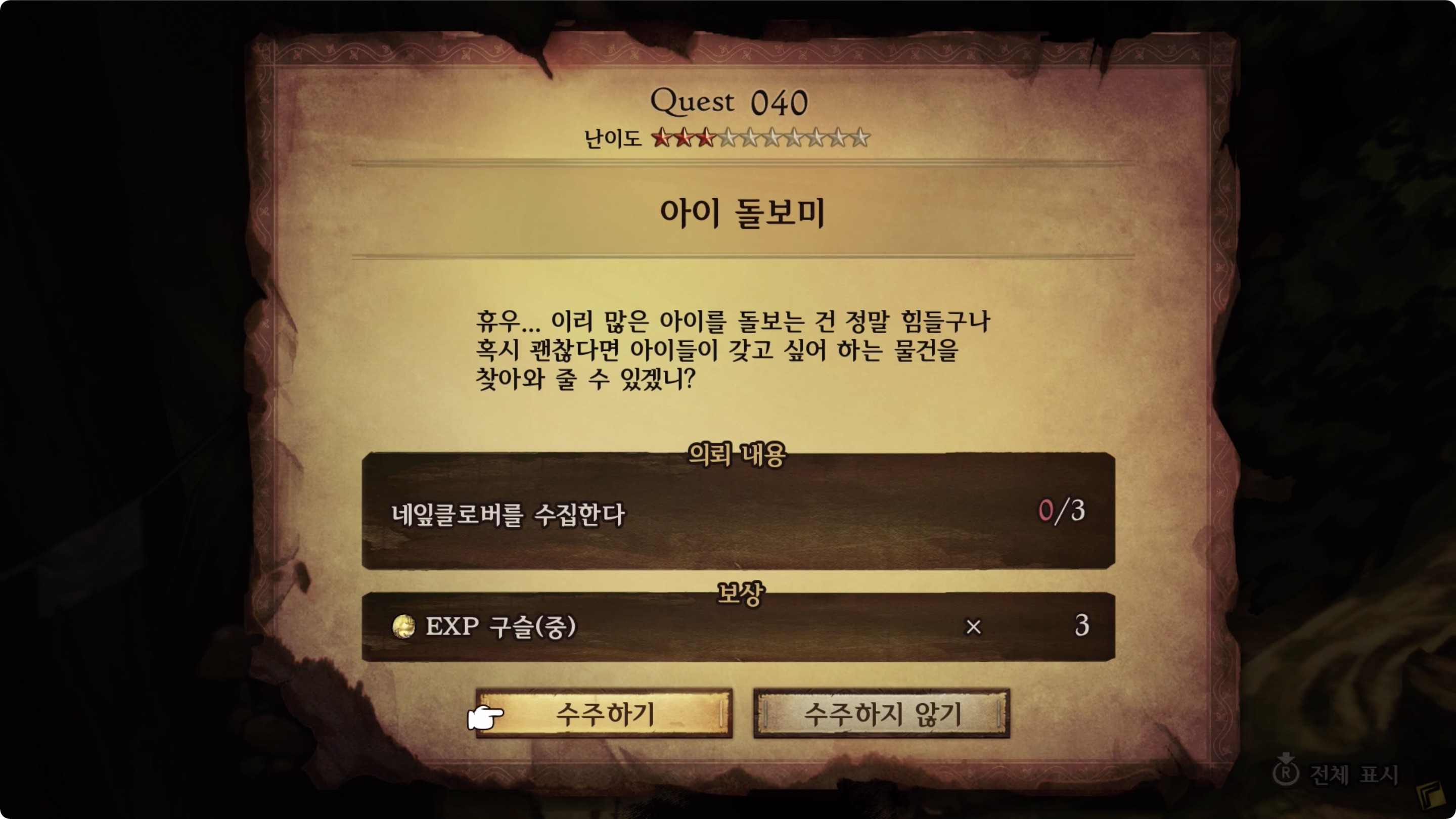 | 의뢰 내용 | 네잎클로버를 수집한다 0/3 |