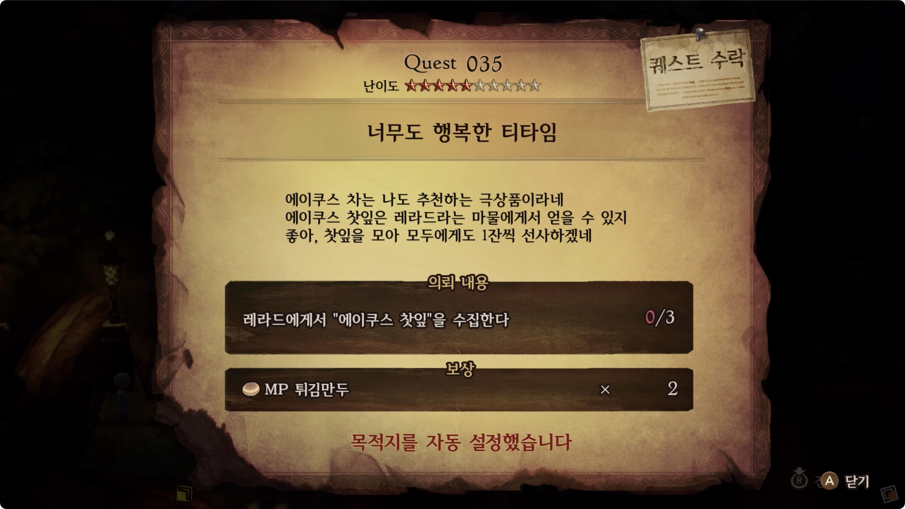 | 의뢰 내용 | 레라드에게서 "에이쿠스 찻잎"을 수집한다 0/3 |