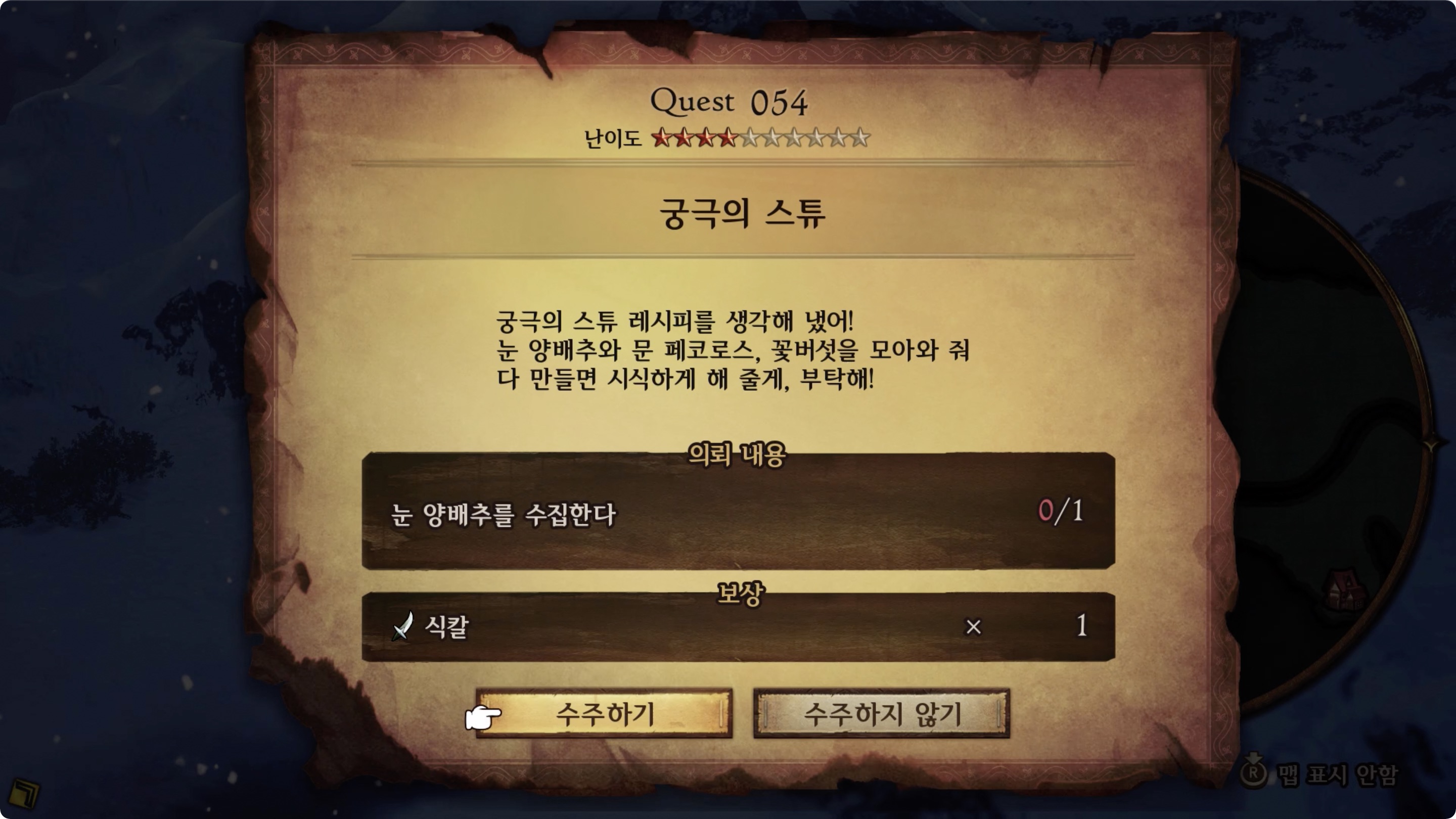| 의뢰 내용 | 눈 양배추를 수집한다 0/1 |