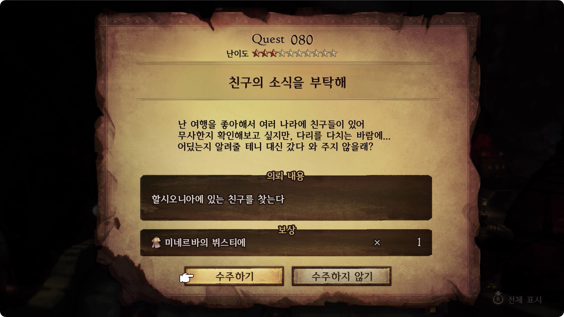 | 보상 | 미네르바의 뷔스티에 x1 |