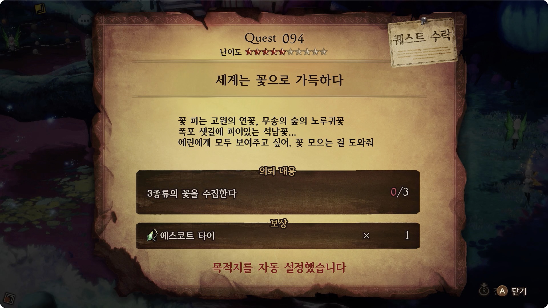 | 의뢰 내용 | 3종류의 꽃을 수집한다 0/3 |