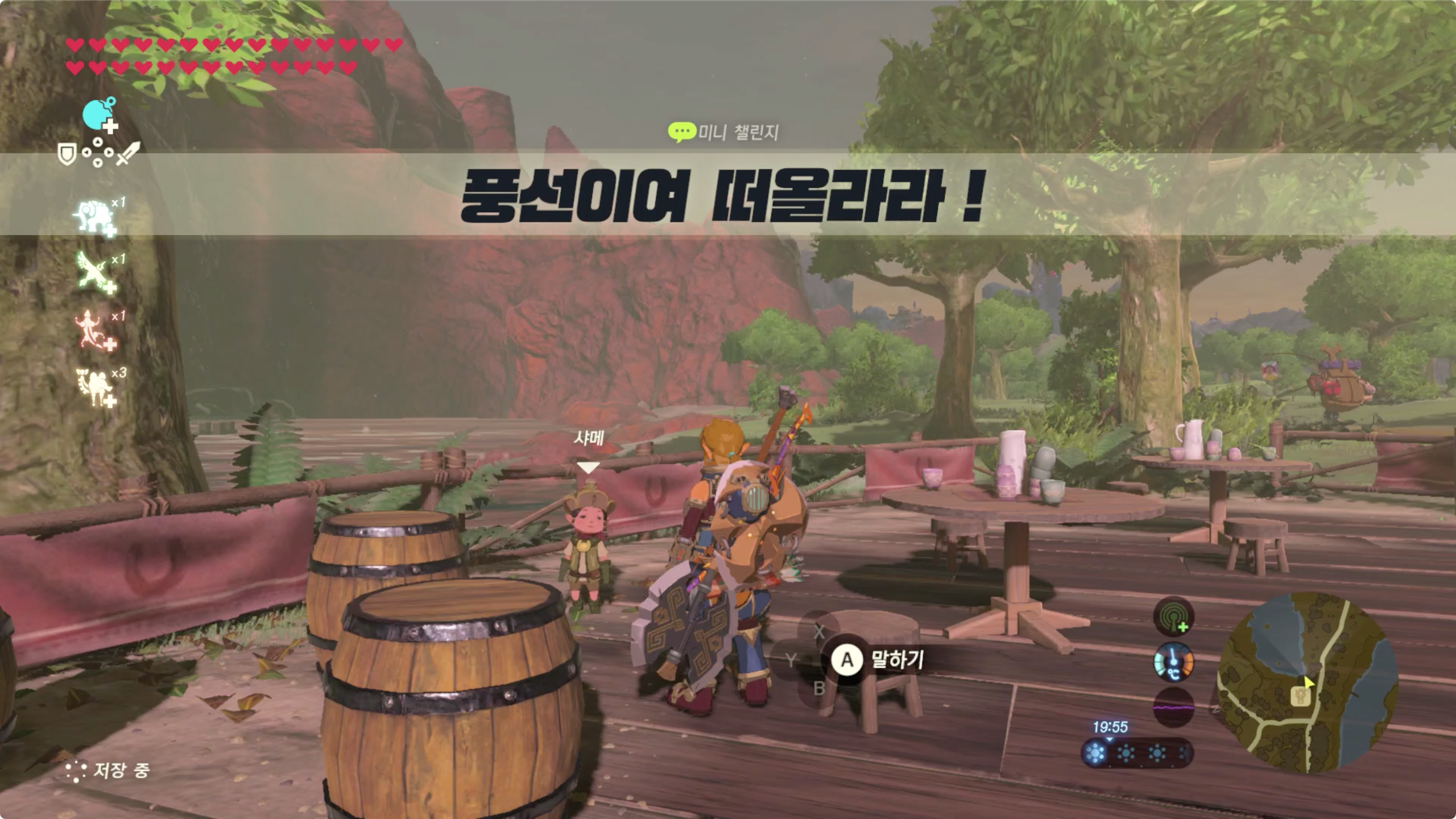 숲의 마구간에 테이블이 많은 곳에 있는 샤메에게 대화를 걸면 발생하는 미니 챌린지.