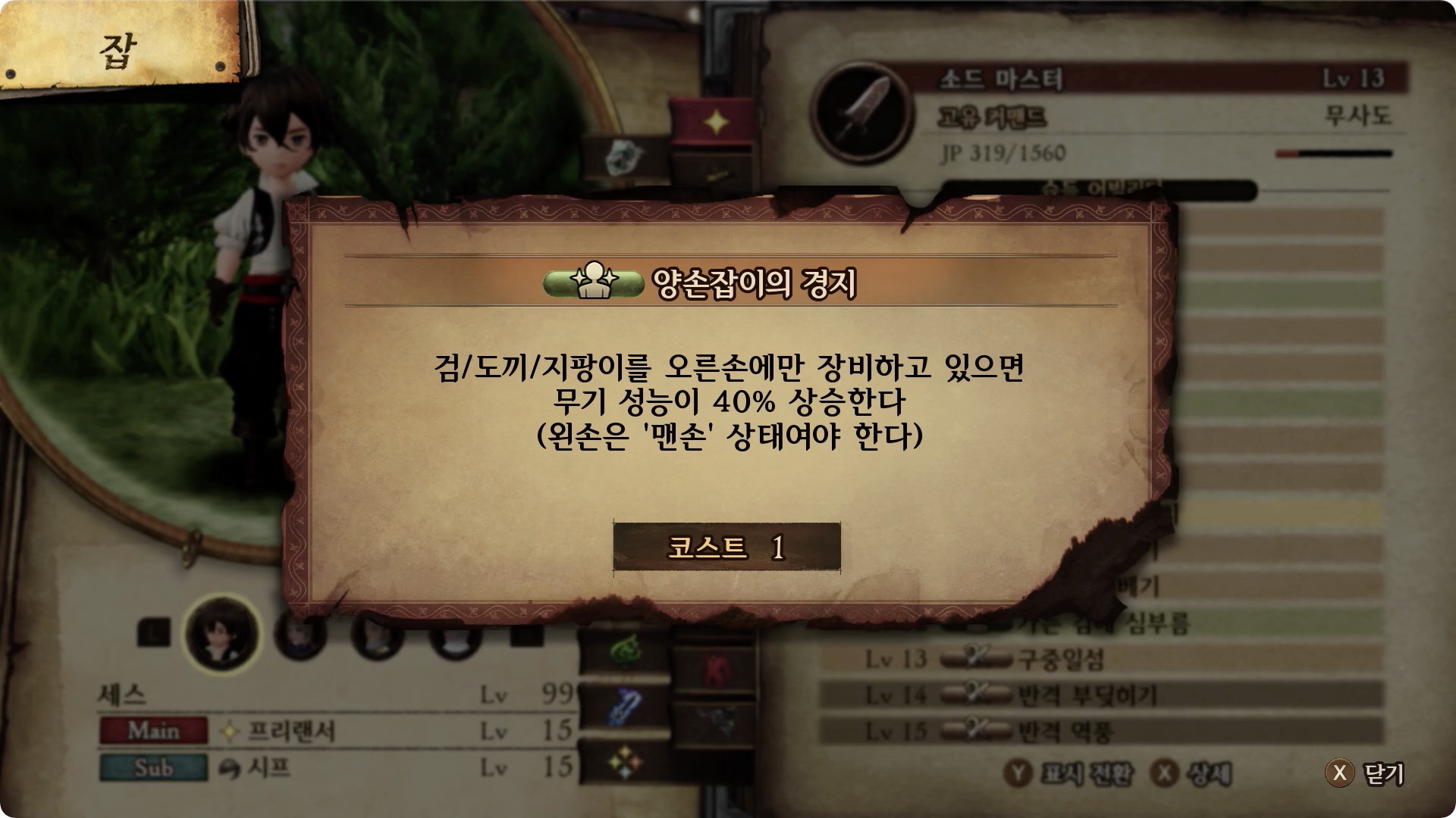 소드 마스터의 스킬 중 양손잡이의 경지 설명.